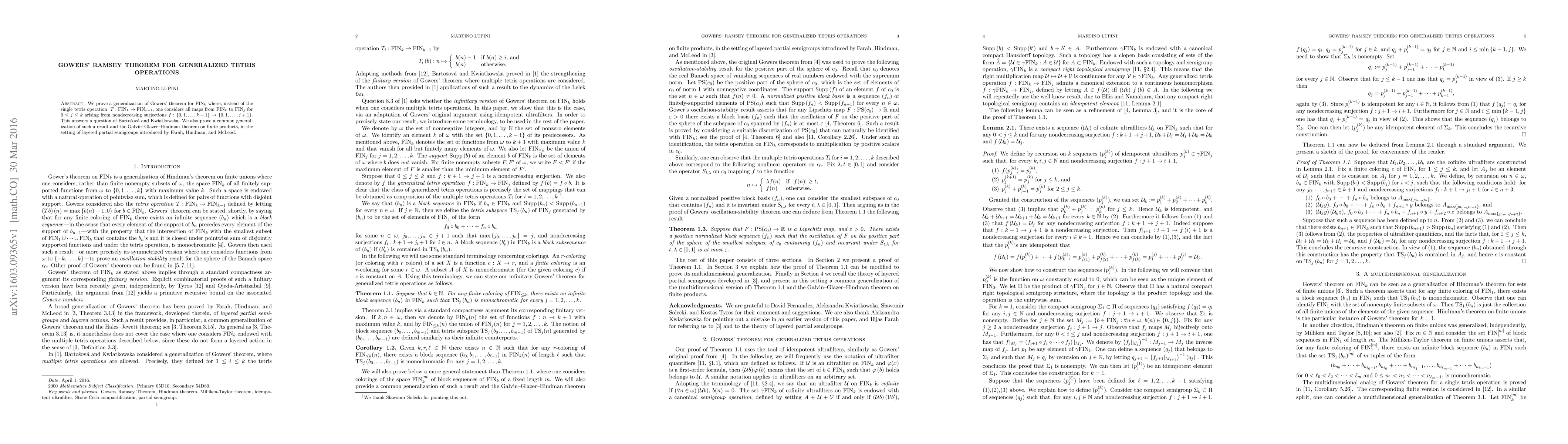 We prove a generalization of Gowers' theorem for $\mathrm{FIN}_{k}$ where, instead of the single tetris operation $T:\mathrm{FIN}_{k}\rightarrow \mathrm{FIN}_{k-1}$, one considers all maps from $\mathrm{FIN}_{k}$ to $\mathrm{FIN}_{j}$ for $0\leq j\leq k$ arising from nondecreasing surjections $f:\left\{ 0,1,\ldots ,k+1\right\} \rightarrow \left\{ 0,1,\ldots ,j+1\right\} $. This answers a question of Barto\v{s}ov\'{a} and Kwiatkowska. We also prove a common generalization of such a result and the Galvin--Glazer--Hindman theorem on finite products, in the setting of layered partial semigroups introduced by Farah, Hindman, and McLeod.