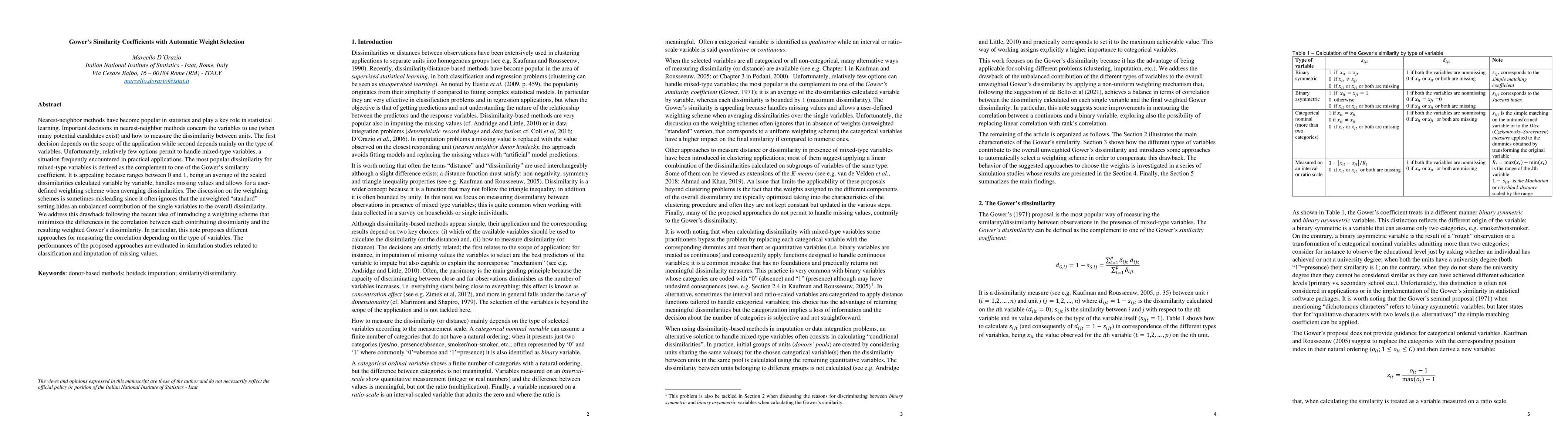 This paper proposes automatic weight selection methods for Gower's similarity coefficients to better handle mixed-type variables in nearest-neighbor methods, aiming to minimize the correlation differences between contributing dissimilarities and the overall weighted dissimilarity. The effectiveness of these approaches is evaluated through simulation studies focused on classification and imputation tasks.