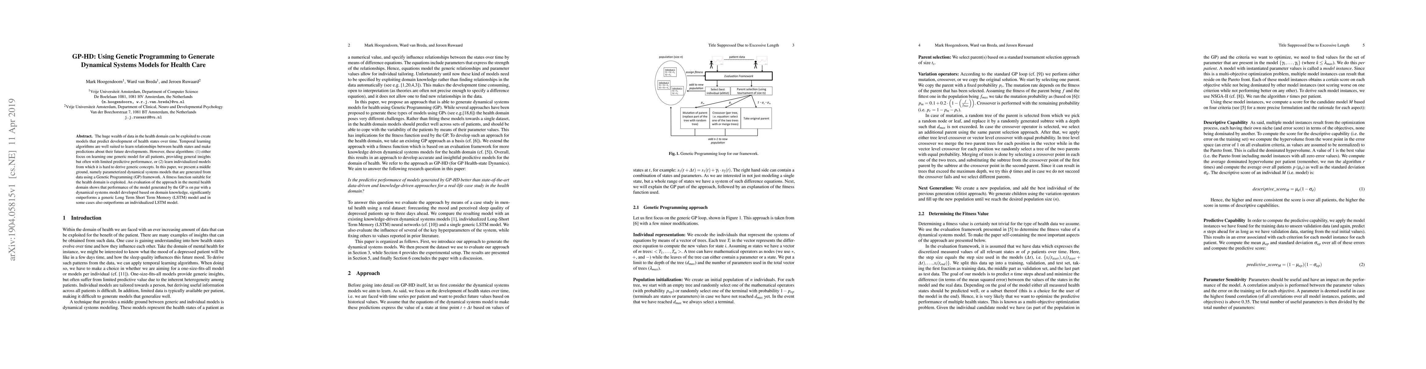 This paper introduces a Genetic Programming (GP) framework to generate parameterized dynamical systems models for predicting health state developments. The approach balances the need for general insights and high predictive performance, outperforming both generic and individualized LSTM models in mental health predictions.