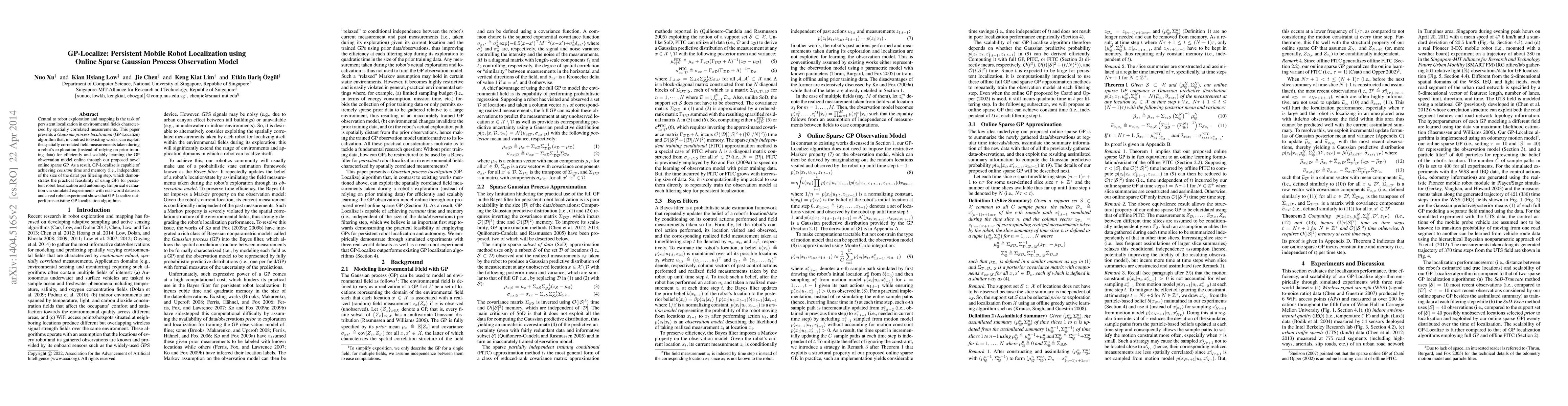 This paper introduces GP-Localize, a novel Gaussian process localization algorithm that leverages online sparse Gaussian processes to efficiently learn spatial correlations in environmental measurements for persistent mobile robot localization, achieving constant time and memory per filtering step. Empirical evaluations demonstrate its superior performance compared to existing algorithms.