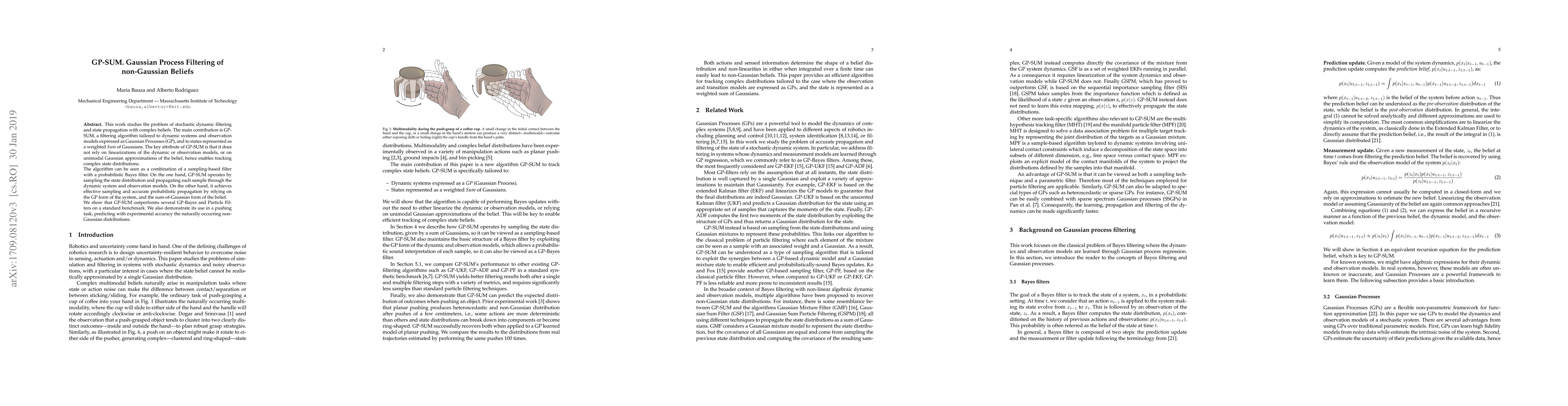 This work studies the problem of stochastic dynamic filtering and state propagation with complex beliefs. The main contribution is GP-SUM, a filtering algorithm tailored to dynamic systems and observation models expressed as Gaussian Processes (GP), and to states represented as a weighted sum of Gaussians. The key attribute of GP-SUM is that it does not rely on linearizations of the dynamic or observation models, or on unimodal Gaussian approximations of the belief, hence enables tracking complex state distributions. The algorithm can be seen as a combination of a sampling-based filter with a probabilistic Bayes filter. On the one hand, GP-SUM operates by sampling the state distribution and propagating each sample through the dynamic system and observation models. On the other hand, it achieves effective sampling and accurate probabilistic propagation by relying on the GP form of the system, and the sum-of-Gaussian form of the belief. We show that GP-SUM outperforms several GP-Bayes and Particle Filters on a standard benchmark. We also demonstrate its use in a pushing task, predicting with experimental accuracy the naturally occurring non-Gaussian distributions.