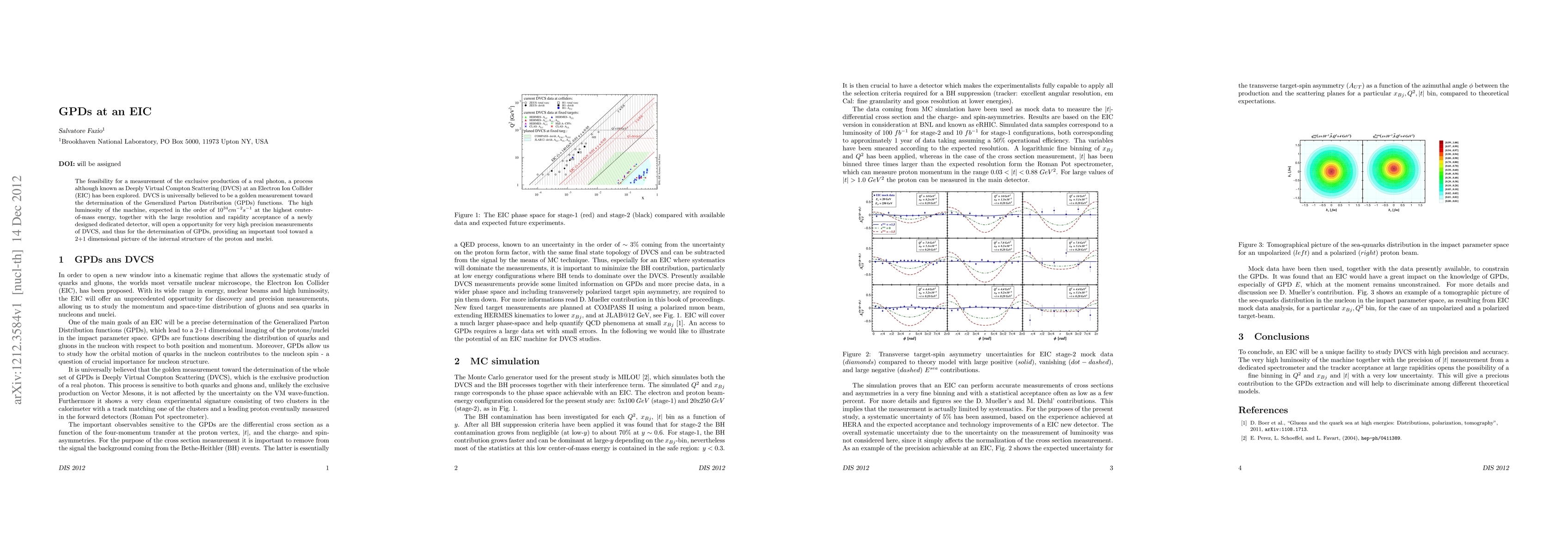 The feasibility for a measurement of the exclusive production of a real photon, a process although known as Deeply Virtual Compton Scattering (DVCS) at an Electron Ion Collider (EIC) has been explored. DVCS is universally believed to be a golden measurement toward the determination of the Generalized Parton Distribution (GPDs) functions. The high luminosity of the machine, expected in the order of 10^34 cm^-2 s^-1 at the highest center-of-mass energy, together with the large resolution and rapidity acceptance of a newly designed dedicated detector, will open a opportunity for very high precision measurements of DVCS, and thus for the determination of GPDs, providing an important tool toward a 2+1 dimensional picture of the internal structure of the proton and nuclei.