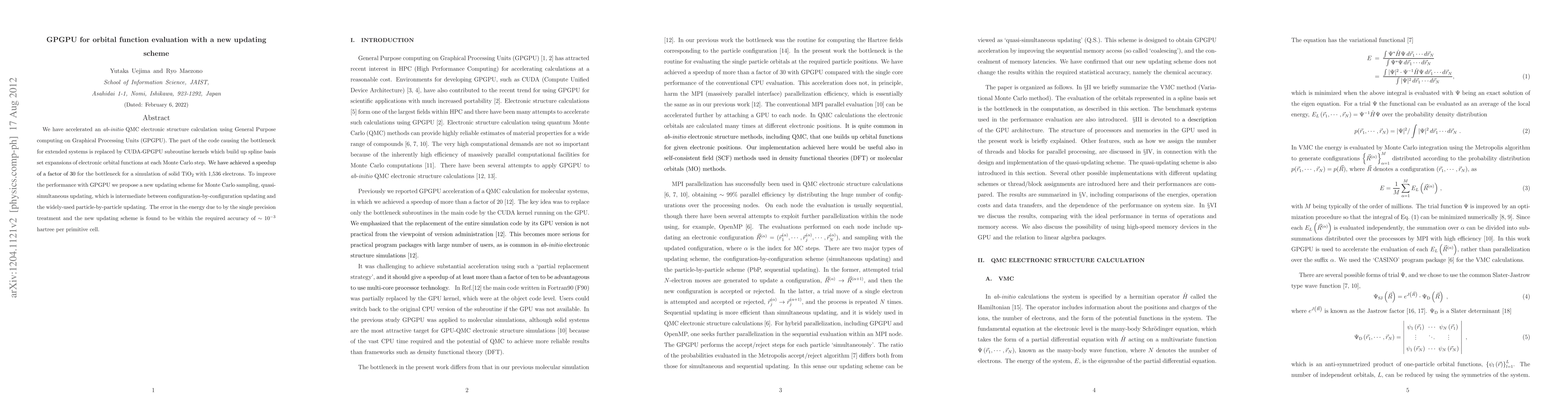 We accelerated an {\it ab-initio} QMC electronic structure calculation by using GPGPU. The bottleneck of the calculation for extended solid systems is replaced by CUDA-GPGPU subroutine kernels which build up spline basis set expansions of electronic orbital functions at each Monte Carlo step. We achieved 30.8 times faster evaluation for the bottleneck, confirmed on the simulation of TiO$_2$ solid with 1,536 electrons. To achieve better performance in GPGPU we propose a new updating scheme for Monte Carlo sampling, quasi-simultaneous updating, which is in between the configuration-by-configuration updating and the widely-used particle-by-particle one. The energy deviation caused both by the single precision treatment and the new updating scheme is found to be within the accuracy required in the calculation, $\sim 10^{-3}$ hartree per primitive cell.