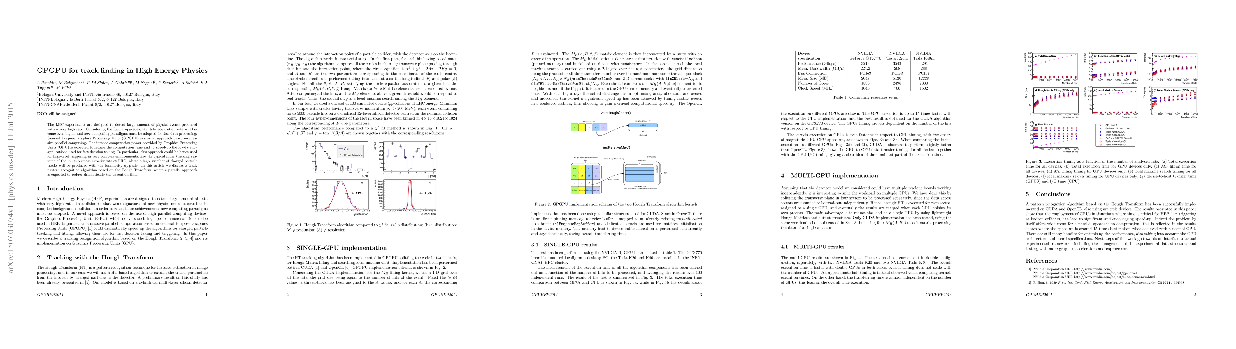 The LHC experiments are designed to detect large amount of physics events produced with a very high rate. Considering the future upgrades, the data acquisition rate will become even higher and new computing paradigms must be adopted for fast data-processing: General Purpose Graphics Processing Units (GPGPU) is a novel approach based on massive parallel computing. The intense computation power provided by Graphics Processing Units (GPU) is expected to reduce the computation time and to speed-up the low-latency applications used for fast decision taking. In particular, this approach could be hence used for high-level triggering in very complex environments, like the typical inner tracking systems of the multi-purpose experiments at LHC, where a large number of charged particle tracks will be produced with the luminosity upgrade. In this article we discuss a track pattern recognition algorithm based on the Hough Transform, where a parallel approach is expected to reduce dramatically the execution time.