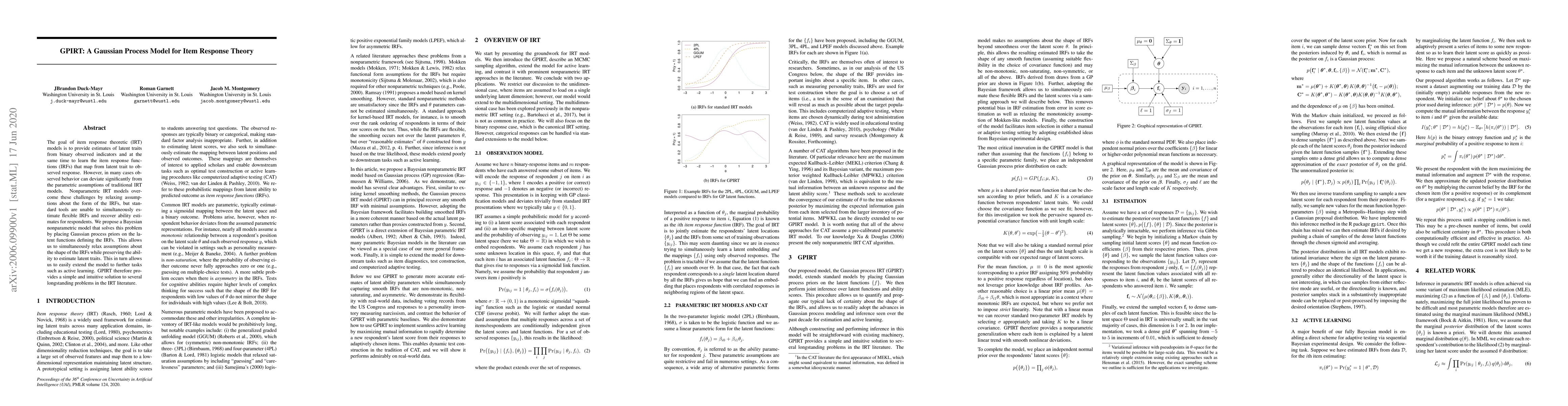 The paper proposes GPIRT, a Bayesian nonparametric Gaussian process model for item response theory that relaxes traditional parametric assumptions while still enabling the estimation of latent traits. This approach allows for flexible item response functions and extends to further applications like active learning.