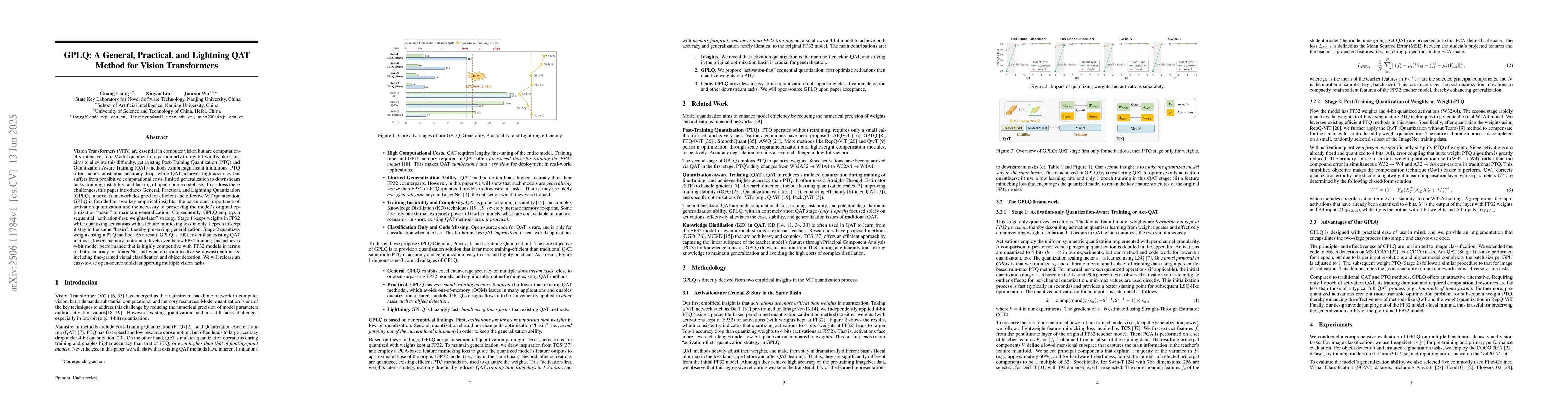 Vision Transformers (ViTs) are essential in computer vision but are computationally intensive, too. Model quantization, particularly to low bit-widths like 4-bit, aims to alleviate this difficulty, yet existing Post-Training Quantization (PTQ) and Quantization-Aware Training (QAT) methods exhibit significant limitations. PTQ often incurs substantial accuracy drop, while QAT achieves high accuracy but suffers from prohibitive computational costs, limited generalization to downstream tasks, training instability, and lacking of open-source codebase. To address these challenges, this paper introduces General, Practical, and Lightning Quantization (GPLQ), a novel framework designed for efficient and effective ViT quantization. GPLQ is founded on two key empirical insights: the paramount importance of activation quantization and the necessity of preserving the model's original optimization ``basin'' to maintain generalization. Consequently, GPLQ employs a sequential ``activation-first, weights-later'' strategy. Stage 1 keeps weights in FP32 while quantizing activations with a feature mimicking loss in only 1 epoch to keep it stay in the same ``basin'', thereby preserving generalization. Stage 2 quantizes weights using a PTQ method. As a result, GPLQ is 100x faster than existing QAT methods, lowers memory footprint to levels even below FP32 training, and achieves 4-bit model performance that is highly competitive with FP32 models in terms of both accuracy on ImageNet and generalization to diverse downstream tasks, including fine-grained visual classification and object detection. We will release an easy-to-use open-source toolkit supporting multiple vision tasks.