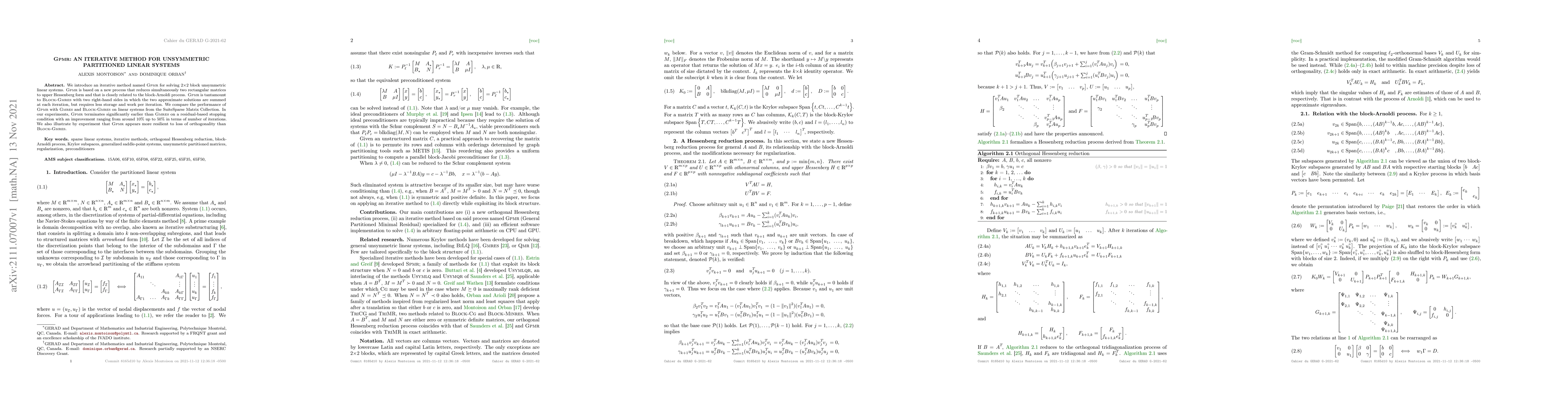 A new iterative method called GPMR improves on GMRES for solving 2x2 block unsymmetric linear systems, reducing iterations by up to 50% while requiring less storage and work per iteration.