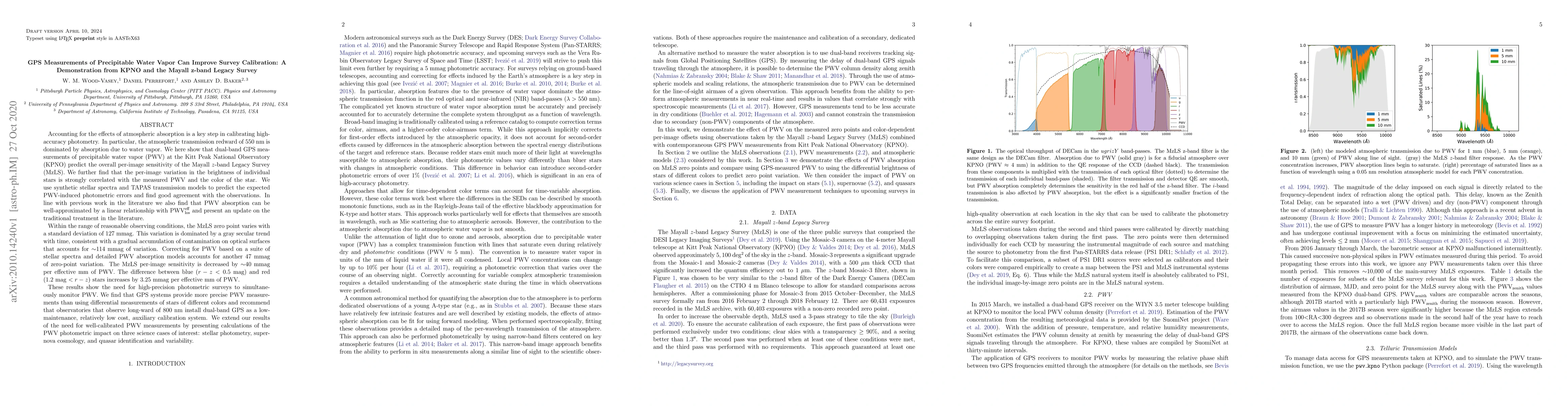 The research demonstrates that GPS measurements of precipitable water vapor (PWV) can significantly improve survey calibration, as shown by the Mayall z-band Legacy Survey (MzLS). PWV variations cause per-image sensitivity changes in MzLS, with a standard deviation of 127 mmag in zero-point variations, largely due to contamination accumulation. Correcting for PWV reduces this variation by 47 mmag. The study recommends dual-band GPS systems for precise, low-cost calibration, impacting stellar photometry, supernova cosmology, and quasar identification.