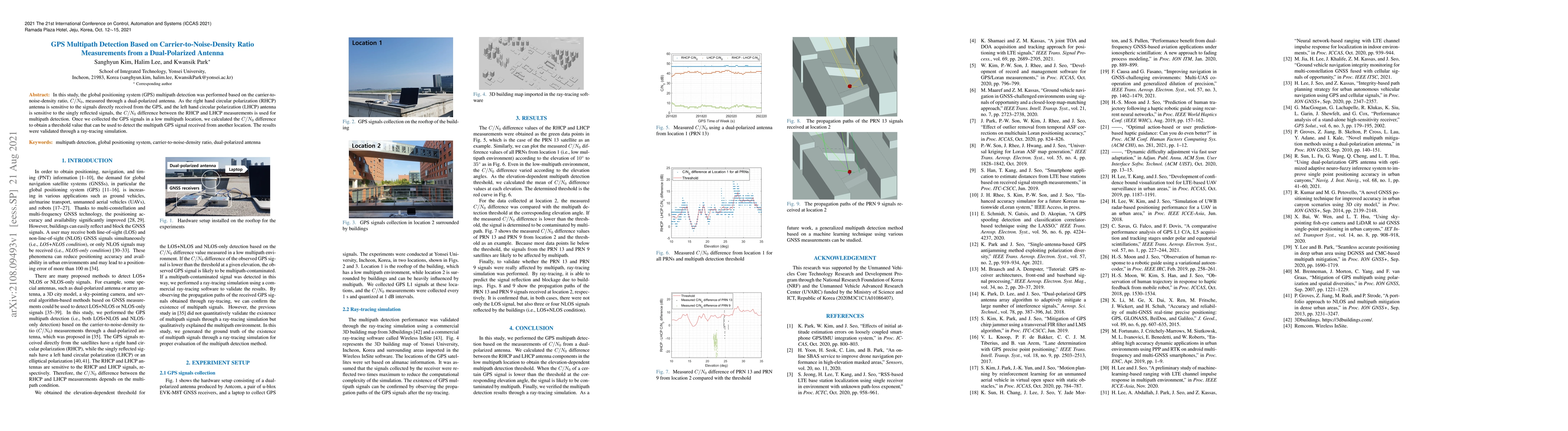 In this study, the global positioning system (GPS) multipath detection was performed based on the carrier-to-noise-density ratio, C/N0, measured through a dual-polarized antenna. As the right hand circular polarization (RHCP) antenna is sensitive to the signals directly received from the GPS, and the left hand circular polarization (LHCP) antenna is sensitive to the singly reflected signals, the C/N0 difference between the RHCP and LHCP measurements is used for multipath detection. Once we collected the GPS signals in a low multipath location, we calculated the C/N0 difference to obtain a threshold value that can be used to detect the multipath GPS signal received from another location. The results were validated through a ray-tracing simulation.