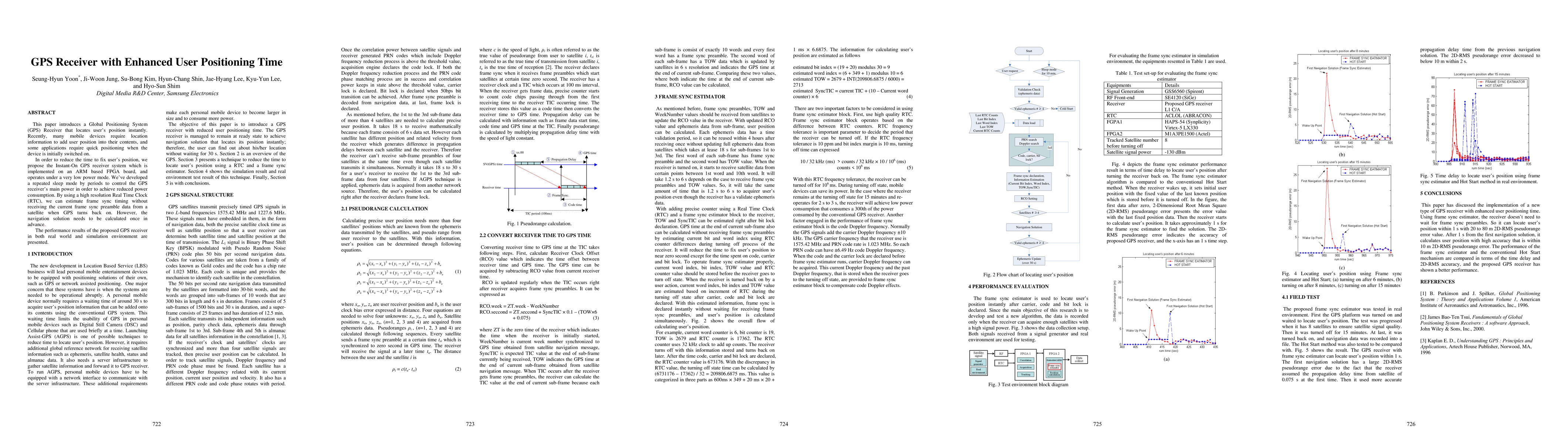 This paper presents an Instant-On GPS receiver implemented on an ARM-based FPGA board that reduces user positioning time and power consumption through a repeated sleep mode and high resolution RTC for frame sync timing estimation. Performance results show improved positioning speed in real-world and simulated environments.