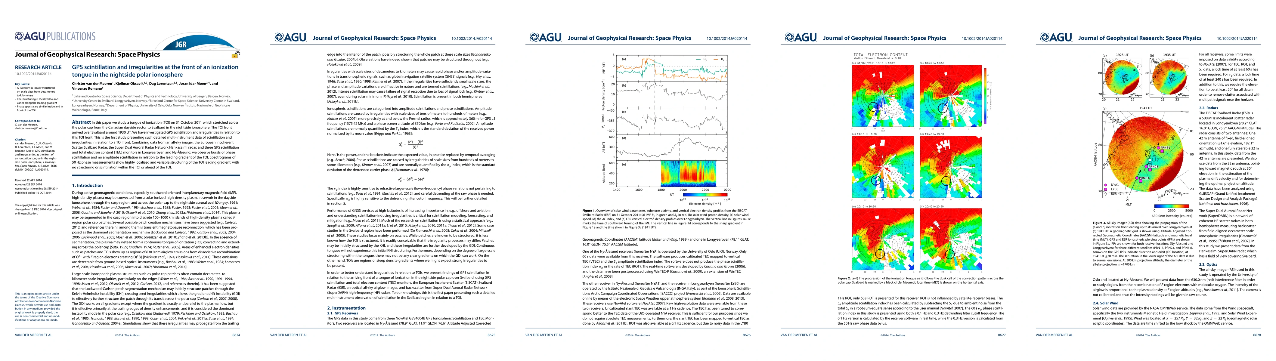 This paper investigates GPS scintillation and irregularities associated with a tongue of ionization (TOI) on the nightside polar ionosphere, revealing bursts of phase scintillation at the TOI front without amplitude scintillation. The study combines data from multiple instruments to provide detailed observations of scintillation and irregularities.