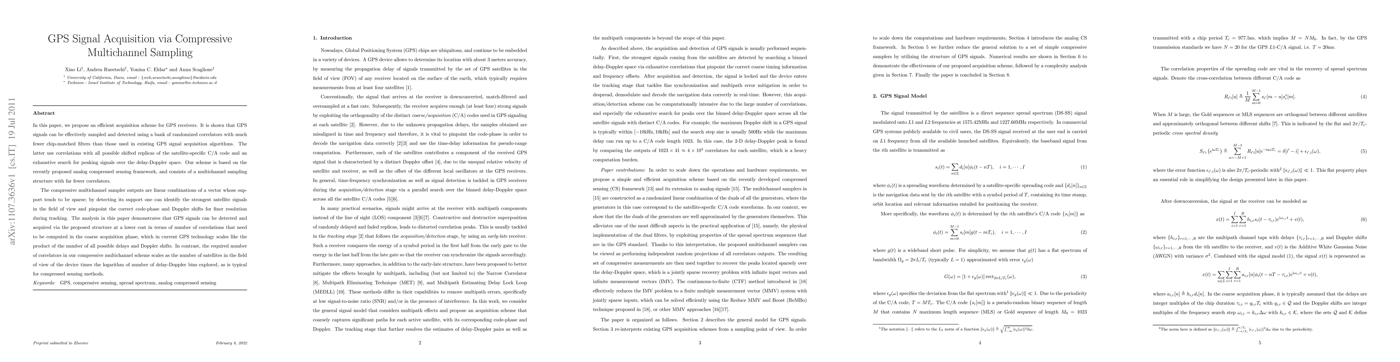 This paper proposes a novel GPS signal acquisition scheme using compressive multichannel sampling, which significantly reduces the number of correlators needed compared to traditional methods. The approach leverages compressed sensing to identify the strongest satellite signals and determine code-phase and Doppler shifts with fewer computations.