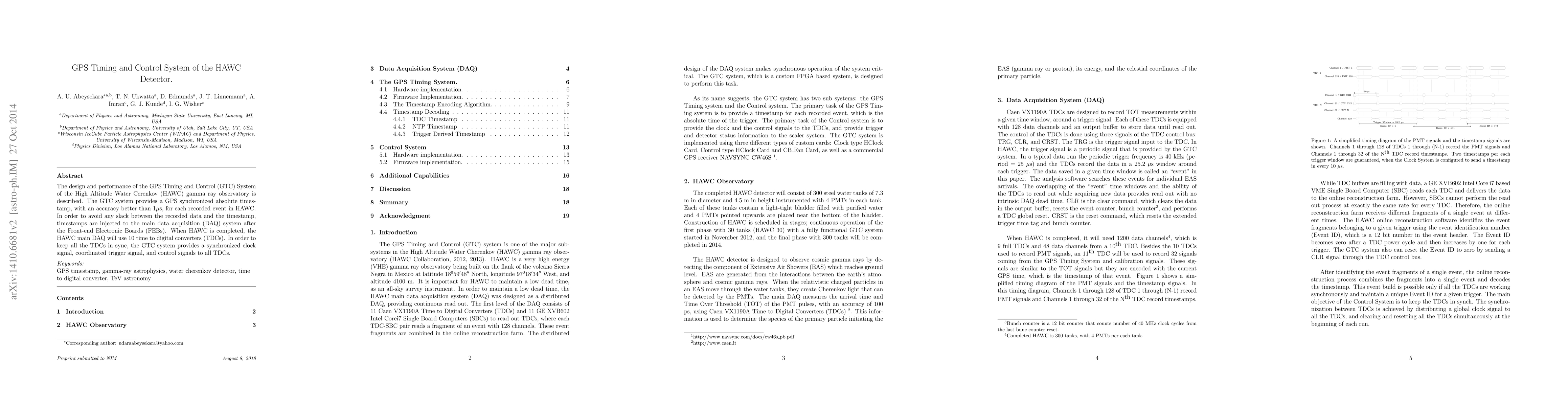 The HAWC gamma ray observatory employs a GPS Timing and Control (GTC) System to provide precise GPS-synchronized timestamps for recorded events with an accuracy better than 1µs. The GTC system ensures synchronization across 10 time-to-digital converters (TDCs) by delivering a synchronized clock, trigger, and control signals.