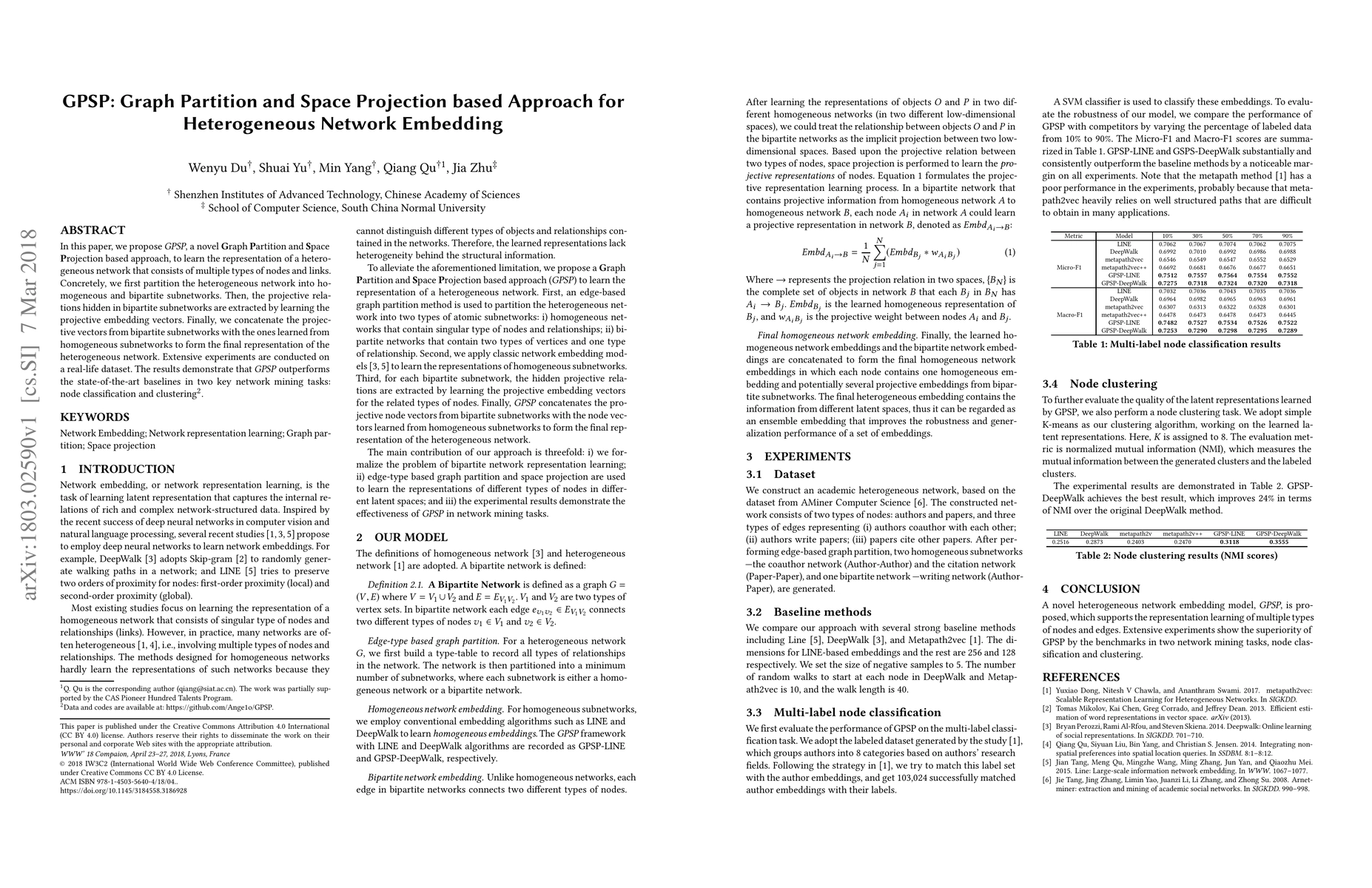 The GPSP approach partitions a heterogeneous network into homogeneous and bipartite subnetworks, then extracts projective embeddings from the bipartite parts and combines them with embeddings from homogeneous parts to represent the network, outperforming baselines in node classification and clustering tasks.