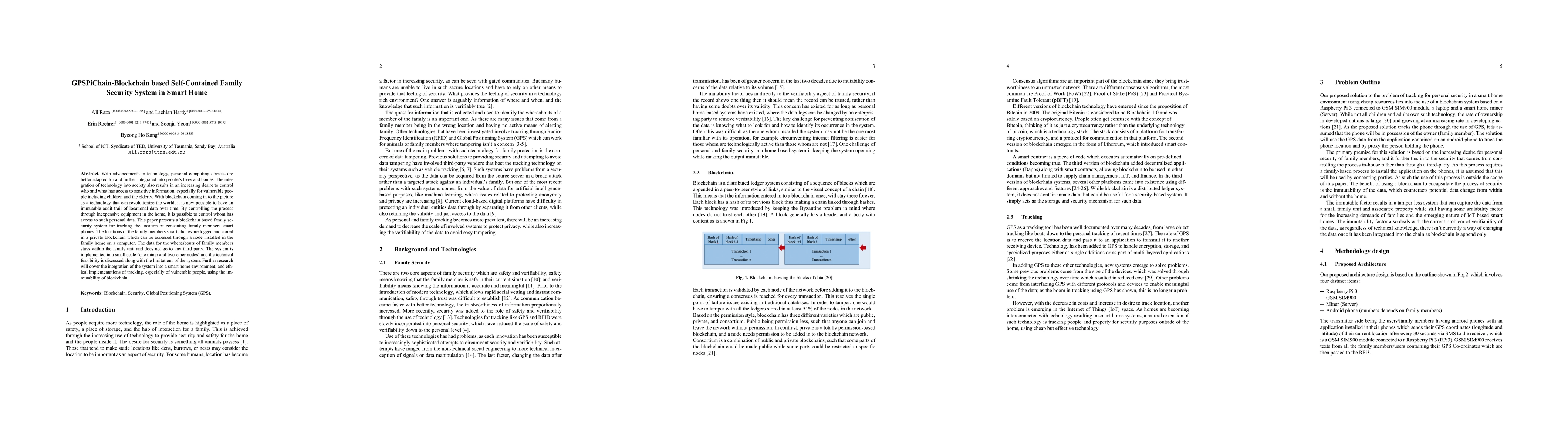 This paper introduces GPSPiChain, a blockchain-based self-contained family security system for smart homes, which tracks consenting family members' smartphone locations in a private blockchain. The system aims to maintain control over personal data access and ensure ethical tracking, especially for vulnerable individuals.