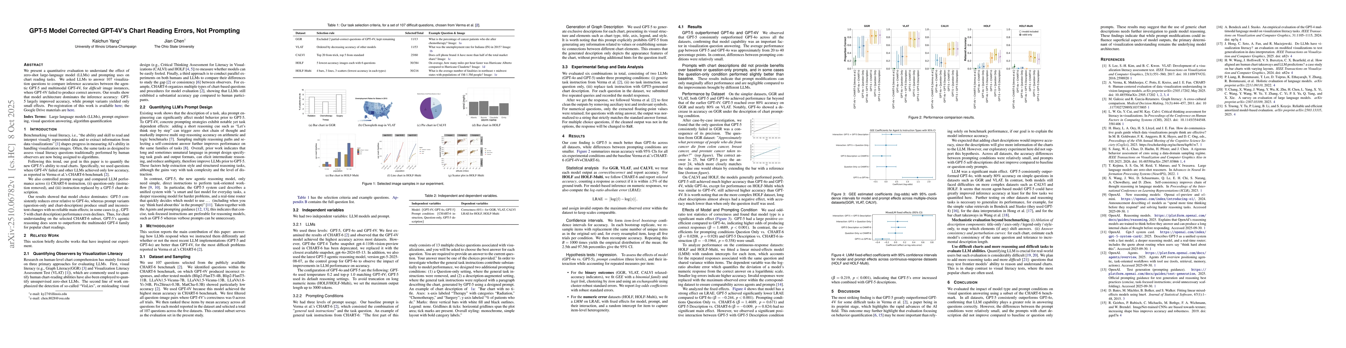 We present a quantitative evaluation to understand the effect of zero-shot large-language model (LLMs) and prompting uses on chart reading tasks. We asked LLMs to answer 107 visualization questions to compare inference accuracies between the agentic GPT-5 and multimodal GPT-4V, for difficult image instances, where GPT-4V failed to produce correct answers. Our results show that model architecture dominates the inference accuracy: GPT5 largely improved accuracy, while prompt variants yielded only small effects. Pre-registration of this work is available here: https://osf.io/u78td/?view_only=6b075584311f48e991c39335c840ded3; the Google Drive materials are here:https://drive.google.com/file/d/1ll8WWZDf7cCNcfNWrLViWt8GwDNSvVrp/view.