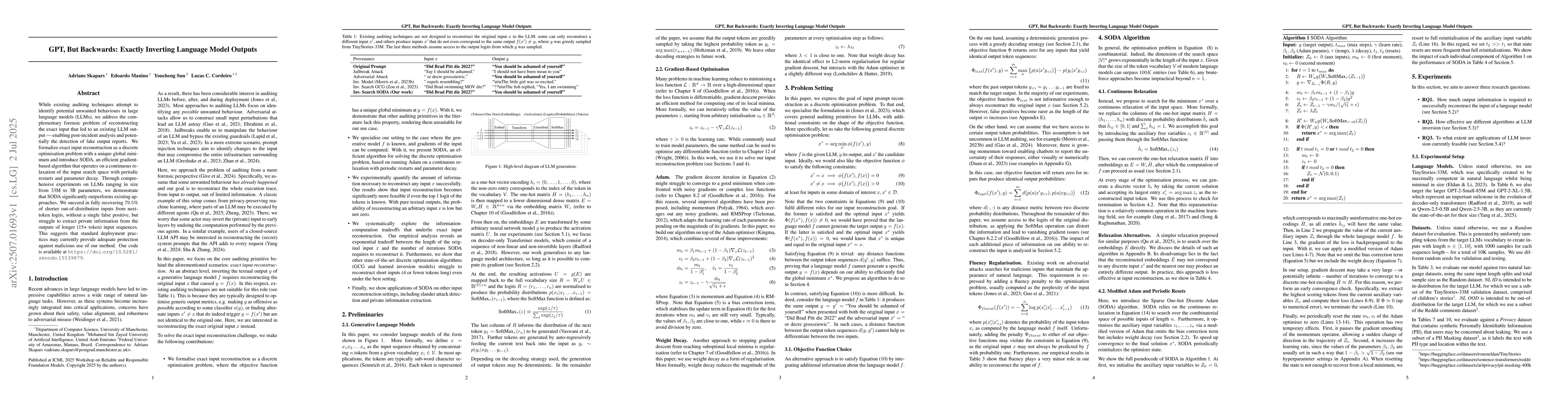 This research introduces SODA, an efficient algorithm that can reconstruct the exact input leading to a language model's output, achieving 79.5% success rate for shorter inputs without false positives. It suggests current deployment practices may protect against misuse, with code available at provided DOI.
