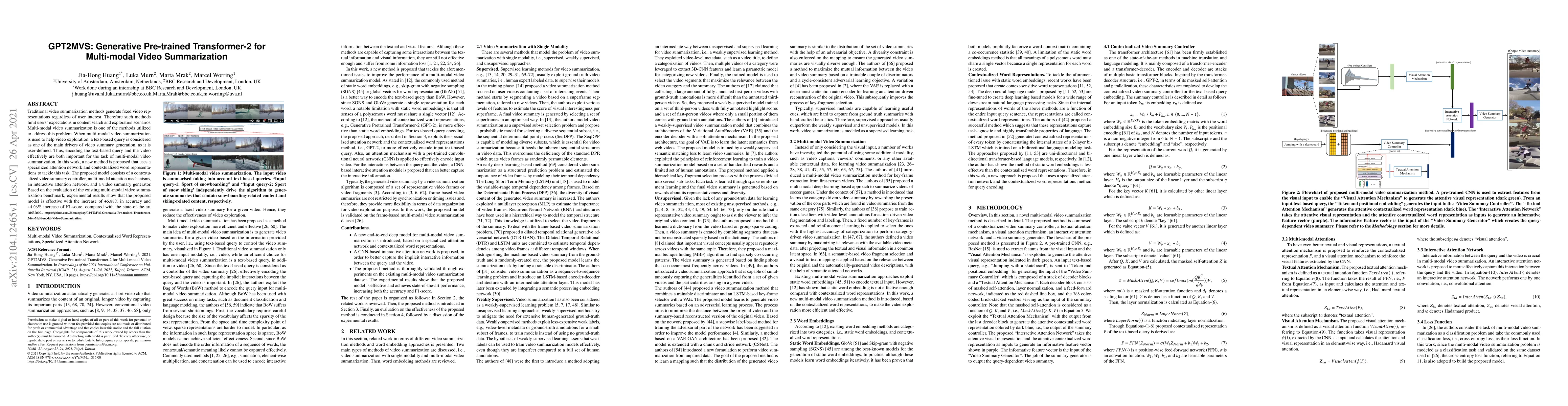 The paper proposes GPT2MVS, a novel method for multi-modal video summarization that incorporates a specialized attention network and contextualized word representations. The model achieves a +5.88% accuracy and +4.06% F1-score improvement over state-of-the-art methods by effectively encoding user-defined text-based queries and video content.