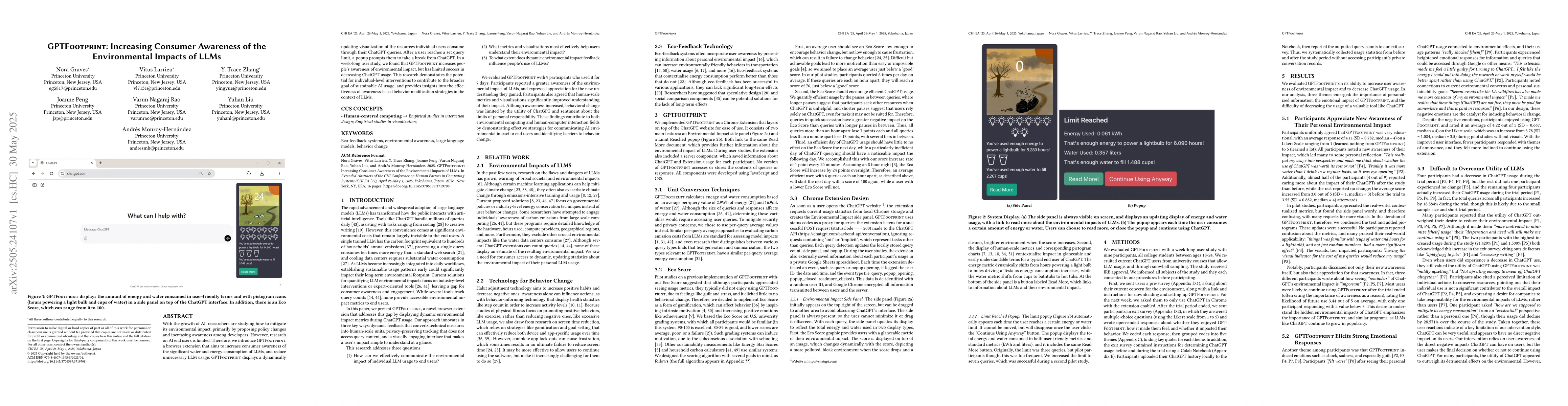 A browser extension called GPTFootprint increases consumer awareness of LLMs' environmental impact, but has limited success in reducing usage. It demonstrates potential for individual-level interventions to contribute to sustainable AI usage.