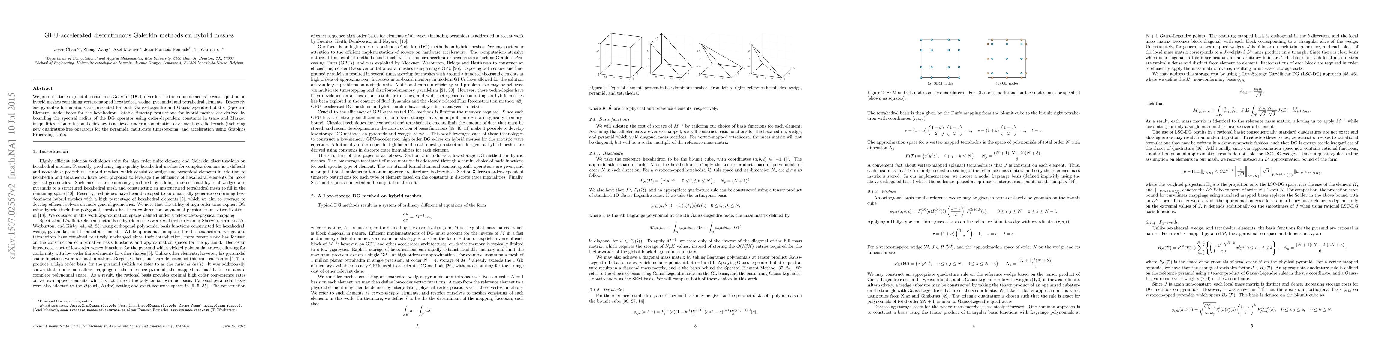 This research introduces a GPU-accelerated DG solver for the time-domain acoustic wave equation on hybrid meshes, employing both Gauss-Legendre and Gauss-Legendre-Lobatto bases. It achieves computational efficiency through element-specific kernels, multi-rate timestepping, and GPU acceleration.
