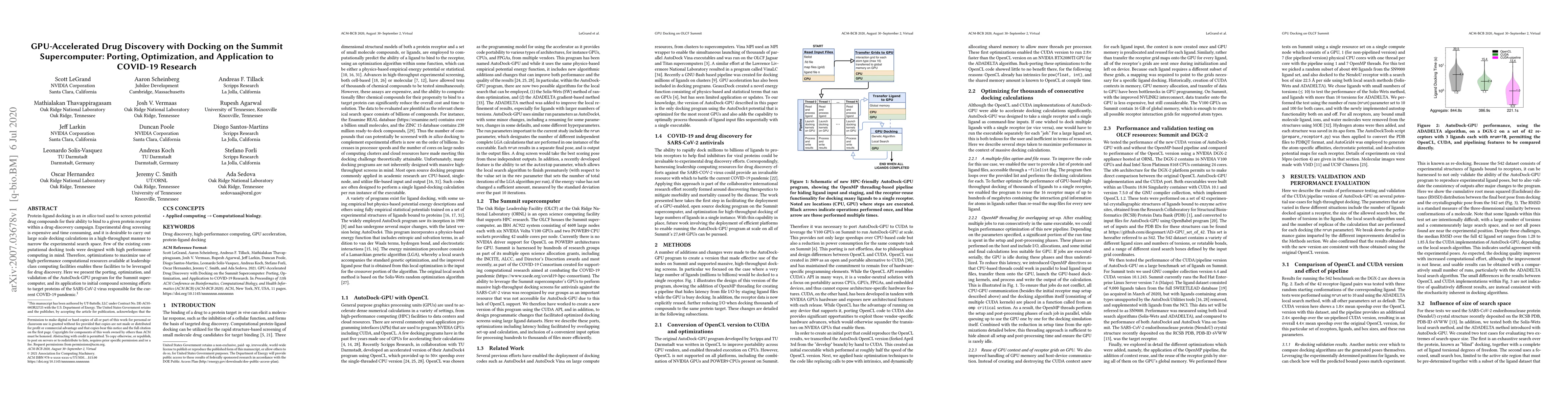 Protein-ligand docking is an in silico tool used to screen potential drug compounds for their ability to bind to a given protein receptor within a drug-discovery campaign. Experimental drug screening is expensive and time consuming, and it is desirable to carry out large scale docking calculations in a high-throughput manner to narrow the experimental search space. Few of the existing computational docking tools were designed with high performance computing in mind. Therefore, optimizations to maximize use of high-performance computational resources available at leadership-class computing facilities enables these facilities to be leveraged for drug discovery. Here we present the porting, optimization, and validation of the AutoDock-GPU program for the Summit supercomputer, and its application to initial compound screening efforts to target proteins of the SARS-CoV-2 virus responsible for the current COVID-19 pandemic.