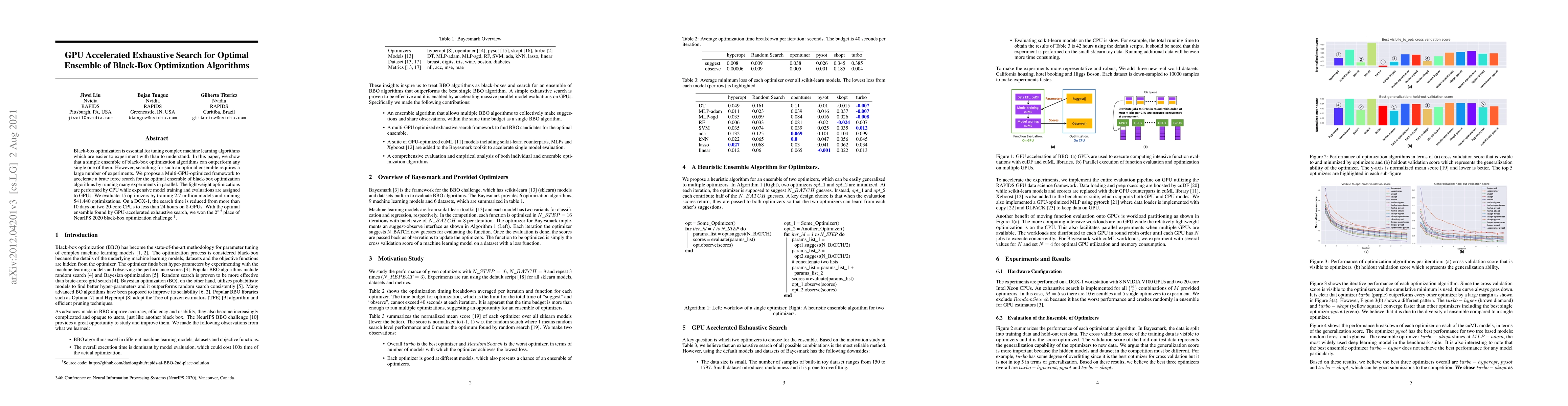 Black-box optimization is essential for tuning complex machine learning algorithms which are easier to experiment with than to understand. In this paper, we show that a simple ensemble of black-box optimization algorithms can outperform any single one of them. However, searching for such an optimal ensemble requires a large number of experiments. We propose a Multi-GPU-optimized framework to accelerate a brute force search for the optimal ensemble of black-box optimization algorithms by running many experiments in parallel. The lightweight optimizations are performed by CPU while expensive model training and evaluations are assigned to GPUs. We evaluate 15 optimizers by training 2.7 million models and running 541,440 optimizations. On a DGX-1, the search time is reduced from more than 10 days on two 20-core CPUs to less than 24 hours on 8-GPUs. With the optimal ensemble found by GPU-accelerated exhaustive search, we won the 2nd place of NeurIPS 2020 black-box optimization challenge.