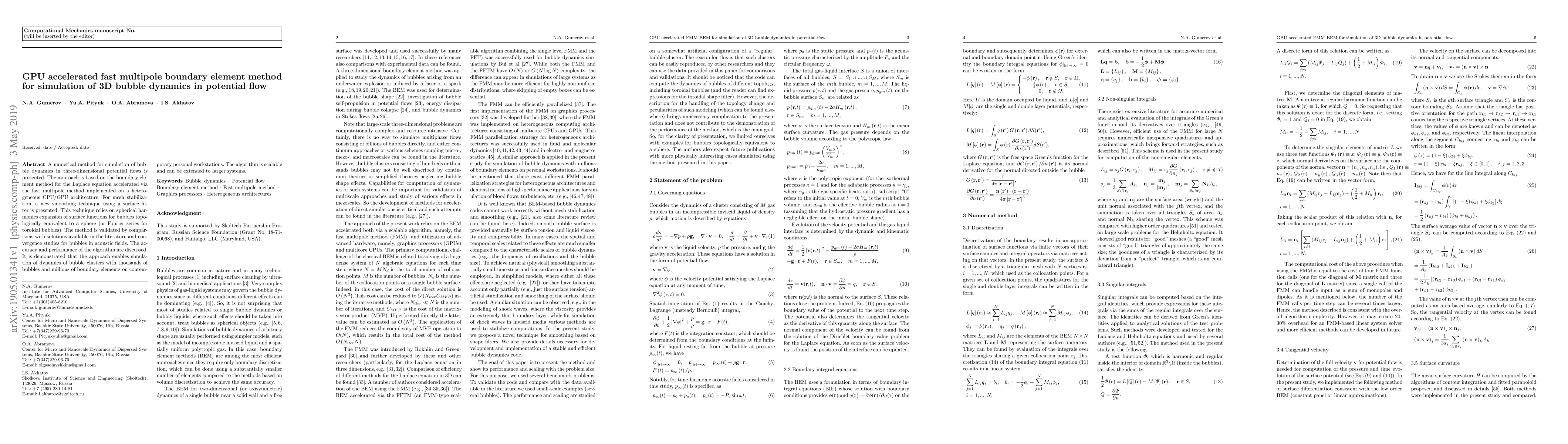 This paper presents a GPU-accelerated fast multipole boundary element method for simulating 3D bubble dynamics in potential flows. The method employs a new smoothing technique for mesh stabilization and demonstrates scalability and high performance for simulating large bubble clusters on personal workstations.