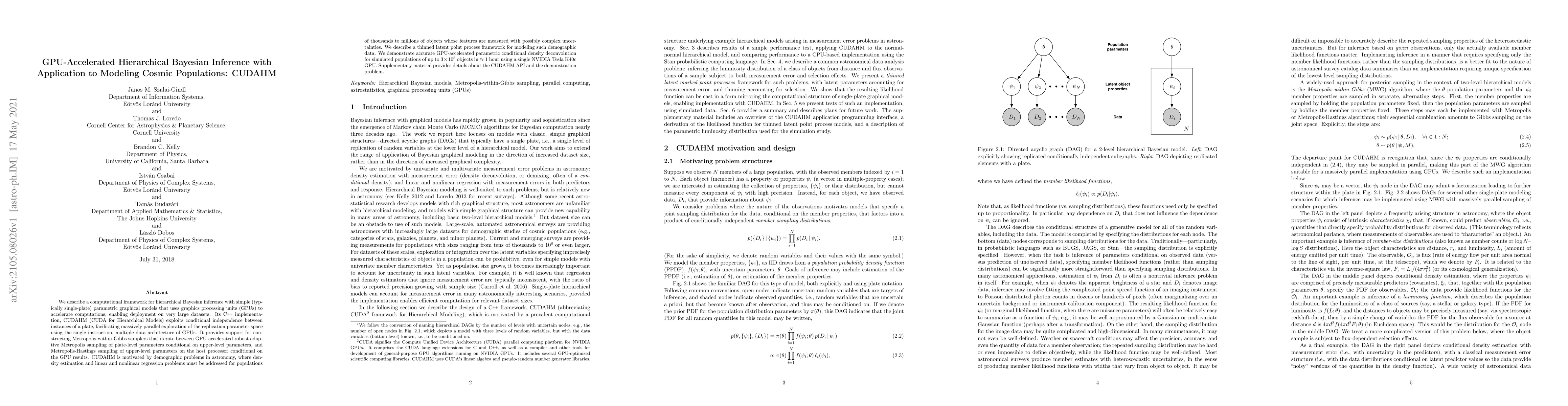 We describe a computational framework for hierarchical Bayesian inference with simple (typically single-plate) parametric graphical models that uses graphics processing units (GPUs) to accelerate computations, enabling deployment on very large datasets. Its C++ implementation, CUDAHM (CUDA for Hierarchical Models) exploits conditional independence between instances of a plate, facilitating massively parallel exploration of the replication parameter space using the single instruction, multiple data architecture of GPUs. It provides support for constructing Metropolis-within-Gibbs samplers that iterate between GPU-accelerated robust adaptive Metropolis sampling of plate-level parameters conditional on upper-level parameters, and Metropolis-Hastings sampling of upper-level parameters on the host processor conditional on the GPU results. CUDAHM is motivated by demographic problems in astronomy, where density estimation and linear and nonlinear regression problems must be addressed for populations of thousands to millions of objects whose features are measured with possibly complex uncertainties. We describe a thinned latent point process framework for modeling such demographic data. We demonstrate accurate GPU-accelerated parametric conditional density deconvolution for simulated populations of up to 300,000 objects in ~1 hour using a single NVIDIA Tesla K40c GPU. Supplementary material provides details about the CUDAHM API and the demonstration problem.