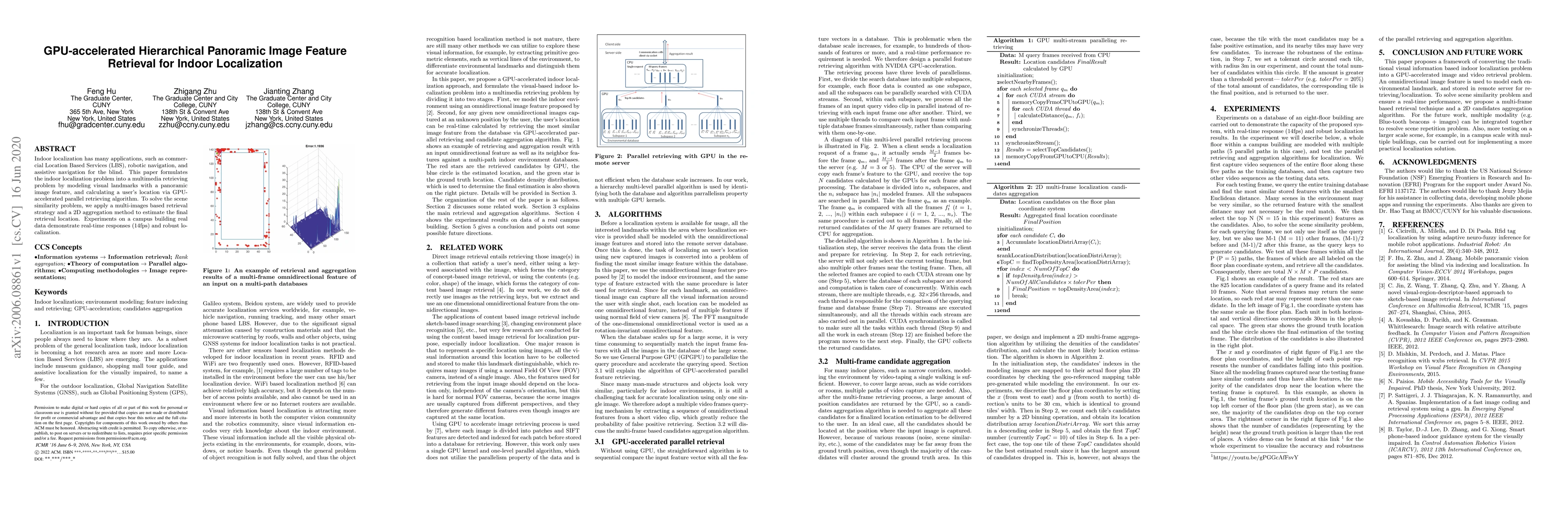 This paper proposes a GPU-accelerated hierarchical panoramic image feature retrieval method for indoor localization, transforming it into a multimedia retrieval problem. The approach uses a multi-image retrieval strategy and 2D aggregation for accurate location estimation, achieving real-time responses and robust results in a campus building environment.