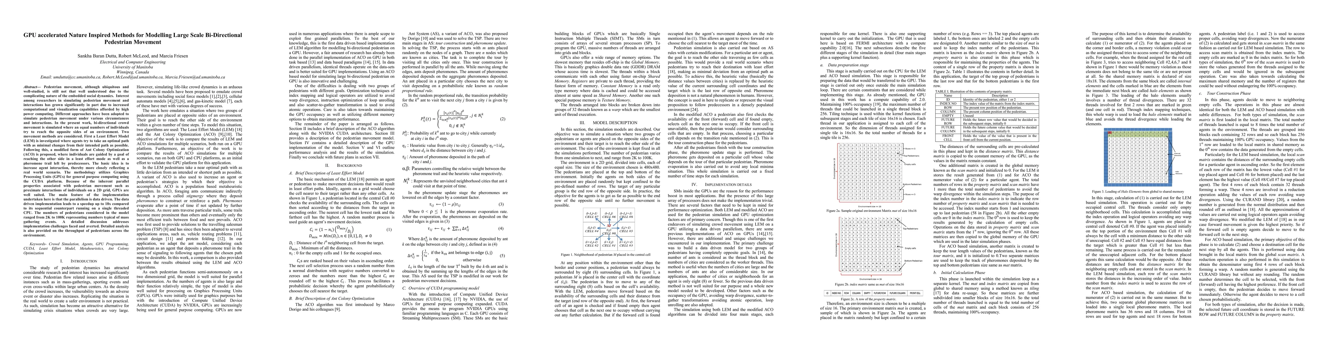 Researchers used GPU acceleration to simulate large-scale pedestrian movement with a new method that combines elements of Least Effort Model and Ant Colony Optimization, achieving up to 18x speedup over sequential CPU calculations.