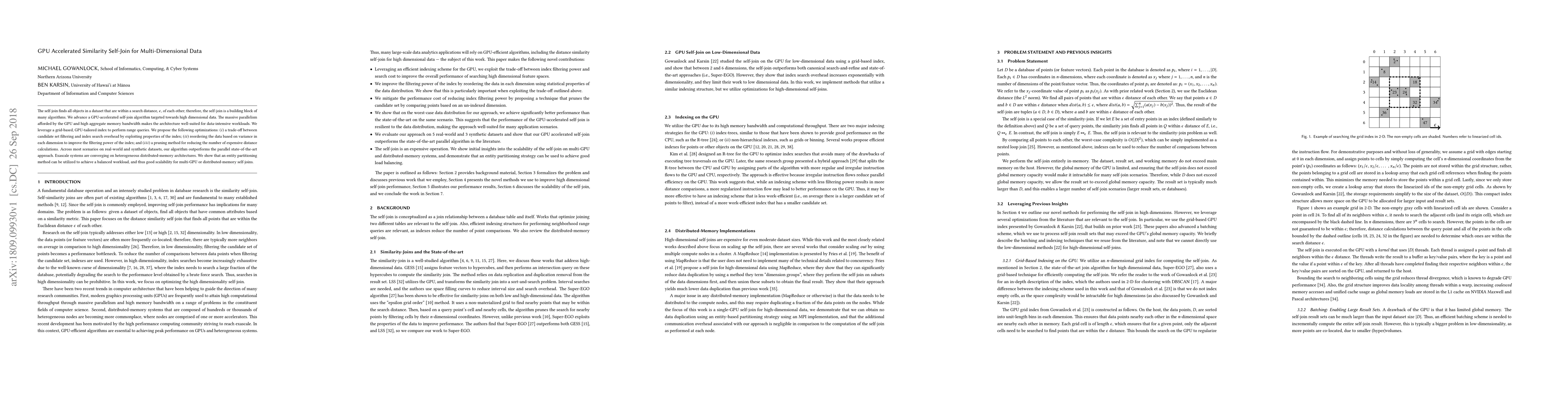 This research introduces a GPU-accelerated self-join algorithm optimized for high-dimensional data, utilizing a grid-based index and various optimizations to outperform existing parallel methods. It also demonstrates scalability across multi-GPU environments through effective workload partitioning.