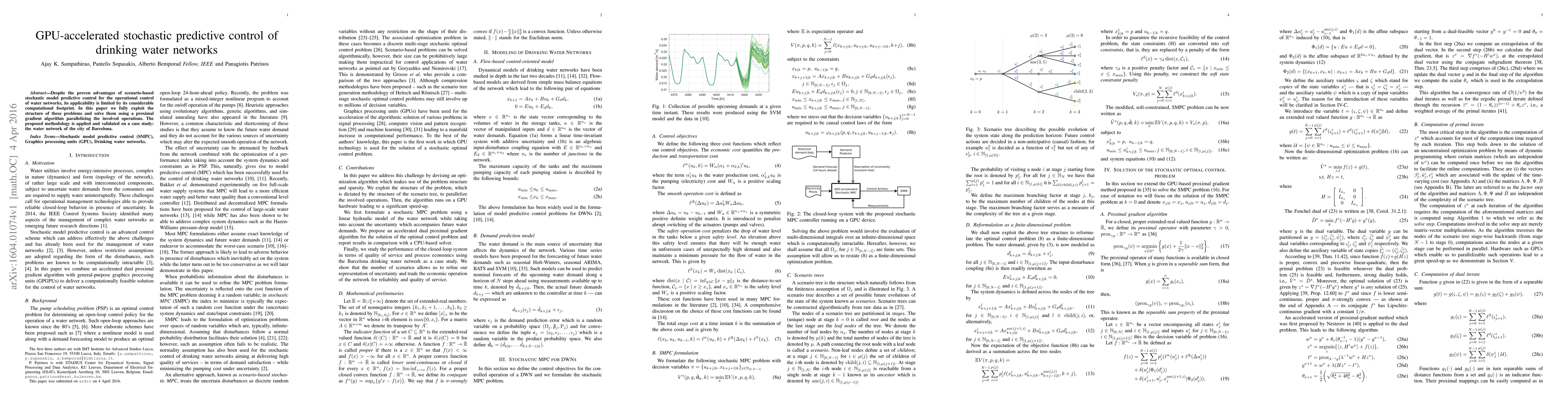 Despite the proven advantages of scenario-based stochastic model predictive control for the operational control of water networks, its applicability is limited by its considerable computational footprint. In this paper we fully exploit the structure of these problems and solve them using a proximal gradient algorithm parallelizing the involved operations. The proposed methodology is applied and validated on a case study: the water network of the city of Barcelona.