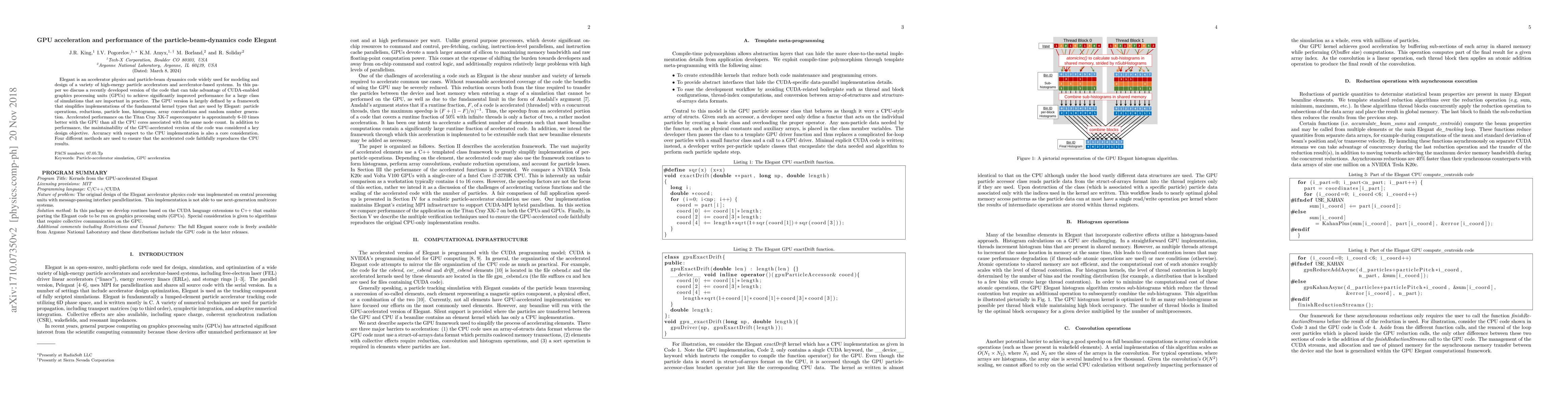This paper presents a GPU-accelerated version of the Elegant particle-beam-dynamics code, achieving 6-10 times better performance on the Titan Cray XK-7 supercomputer compared to CPU-only implementations. The GPU framework simplifies kernel implementations and maintains code accuracy through multiple verification methods.