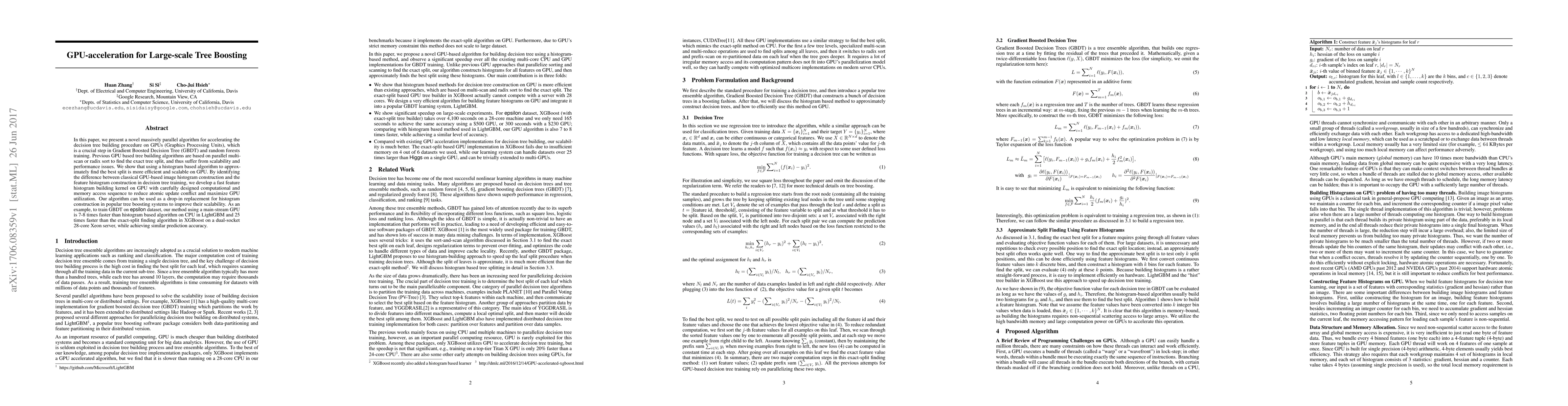 This paper introduces a novel GPU-accelerated algorithm for building decision trees in large-scale tree boosting, using a histogram-based approach to find approximate splits efficiently. The proposed method significantly outperforms previous exact-split algorithms on GPUs, achieving up to 25 times faster training times while maintaining similar prediction accuracy.