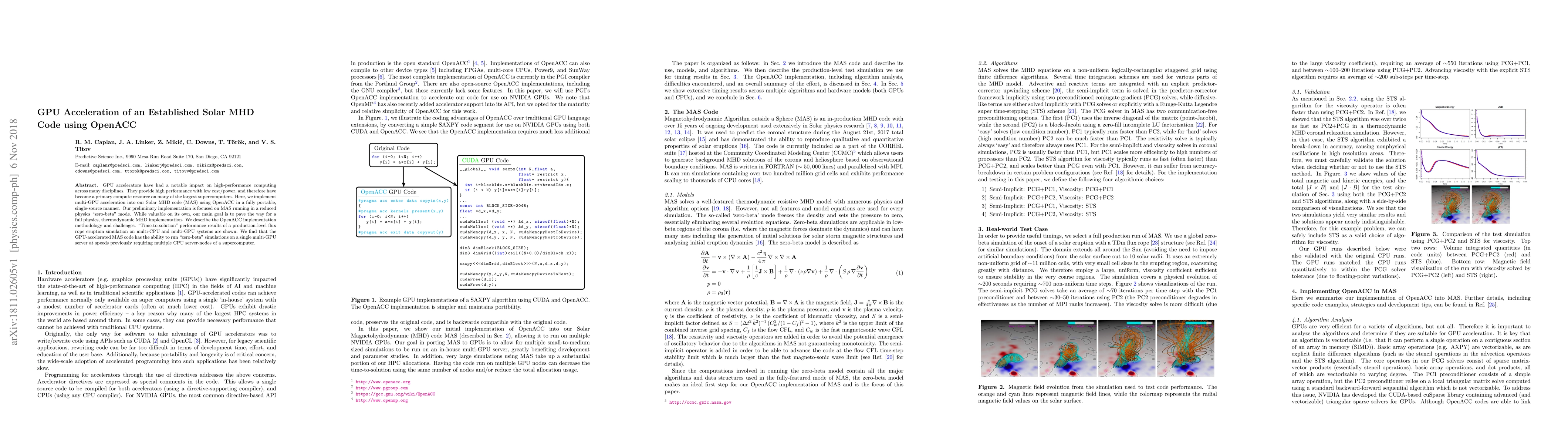 GPU accelerators have had a notable impact on high-performance computing across many disciplines. They provide high performance with low cost/power, and therefore have become a primary compute resource on many of the largest supercomputers. Here, we implement multi-GPU acceleration into our Solar MHD code (MAS) using OpenACC in a fully portable, single-source manner. Our preliminary implementation is focused on MAS running in a reduced physics "zero-beta" mode. While valuable on its own, our main goal is to pave the way for a full physics, thermodynamic MHD implementation. We describe the OpenACC implementation methodology and challenges. "Time-to-solution" performance results of a production-level flux rope eruption simulation on multi-CPU and multi-GPU systems are shown. We find that the GPU-accelerated MAS code has the ability to run "zero-beta" simulations on a single multi-GPU server at speeds previously requiring multiple CPU server-nodes of a supercomputer.