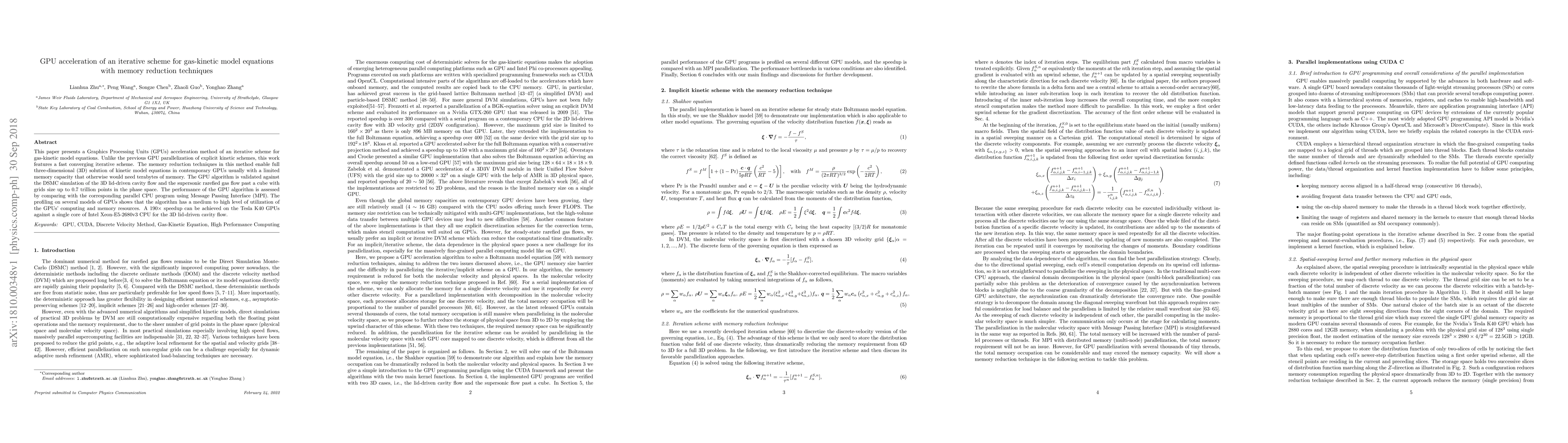 This paper introduces a GPU-accelerated iterative scheme for solving gas-kinetic model equations, featuring fast convergence and memory reduction techniques, enabling full 3D solutions on contemporary GPUs. The method achieves significant speedups, up to 190x, compared to parallel CPU programs for complex flow simulations.