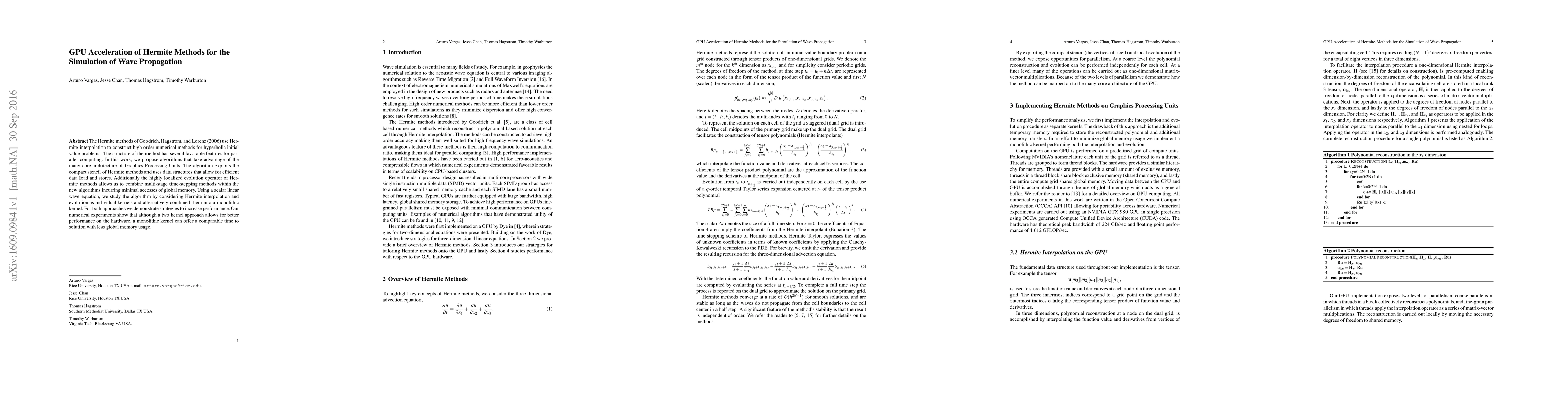 The Hermite methods of Goodrich, Hagstrom, and Lorenz (2006) use Hermite interpolation to construct high order numerical methods for hyperbolic initial value problems. The structure of the method has several favorable features for parallel computing. In this work, we propose algorithms that take advantage of the many-core architecture of Graphics Processing Units. The algorithm exploits the compact stencil of Hermite methods and uses data structures that allow for efficient data load and stores. Additionally the highly localized evolution operator of Hermite methods allows us to combine multi-stage time-stepping methods within the new algorithms incurring minimal accesses of global memory. Using a scalar linear wave equation, we study the algorithm by considering Hermite interpolation and evolution as individual kernels and alternatively combined them into a monolithic kernel. For both approaches we demonstrate strategies to increase performance. Our numerical experiments show that although a two kernel approach allows for better performance on the hardware, a monolithic kernel can offer a comparable time to solution with less global memory usage.