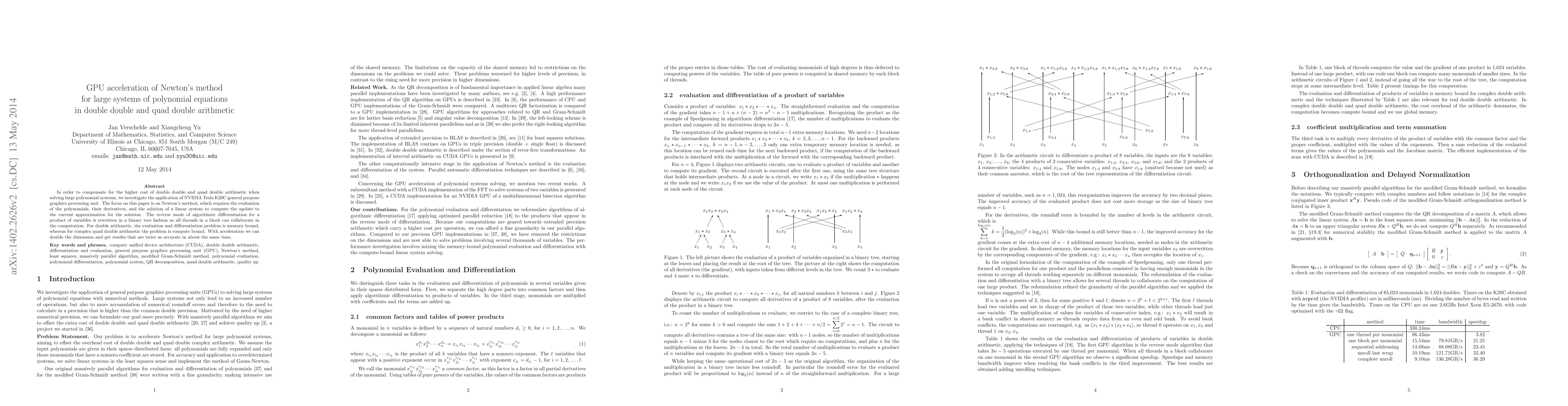 This paper explores leveraging an NVIDIA Tesla K20C GPU to accelerate Newton's method for solving large systems of polynomial equations using double double and quad double arithmetic. The method rewrites the reverse mode of algorithmic differentiation in a binary tree format to optimize parallel computation, effectively doubling the problem dimension and accuracy with minimal time increase.