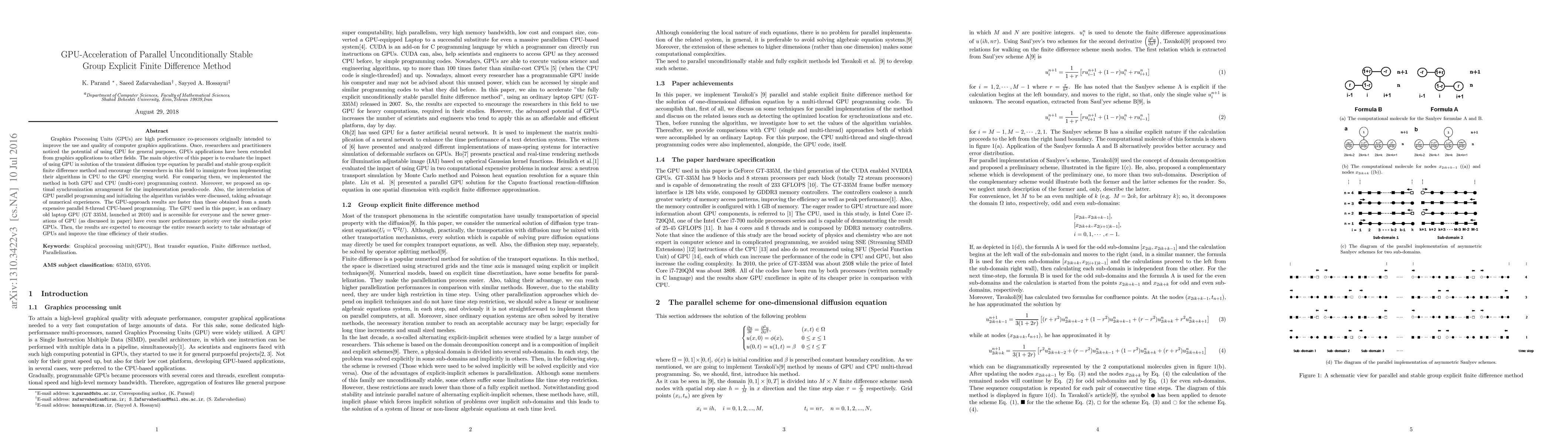 Graphics Processing Units (GPUs) are high performance co-processors originally intended to improve the use and quality of computer graphics applications. Once, researchers and practitioners noticed the potential of using GPU for general purposes, GPUs applications have been extended from graphics applications to other fields. The main objective of this paper is to evaluate the impact of using GPU in solution of the transient diffusion type equation by parallel and stable group explicit finite difference method and encourage the researchers in this field to immigrate from implementing their algorithms in CPU to the GPU emerging world. For comparing them, we implemented the method in both GPU and CPU (multi-core) programming context. Moreover, we proposed an optimal synchronization arrangement for the implementation pseudo-code. Also, the interrelation of GPU parallel programming and initializing the algorithm variables were discussed, taking advantage of numerical experiences. The GPU-approach results are faster than those obtained from a much expensive parallel 8-thread CPU-based programming. The GPU used in this paper, is an ordinary old laptop GPU (GT 335M, launched at 2010) and is accessible for everyone and the newer generations of GPU (as discussed in paper) have even more performance priority over the similar-price GPUs. Then, the results are expected to encourage the entire research society to take advantage of GPUs and improve the time efficiency of their studies.
