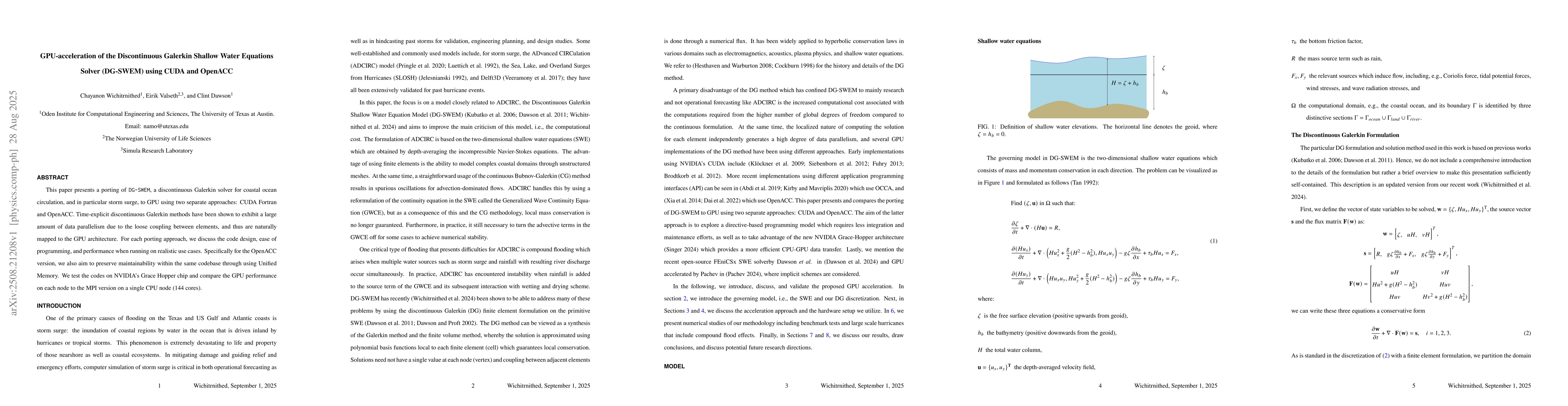 This paper presents a porting of DG-SWEM, a discontinuous Galerkin solver for coastal ocean circulation, and in particular storm surge, to GPU using two separate approaches: CUDA Fortran and OpenACC. Time-explicit discontinuous Galerkin methods have been shown to exhibit a large amount of data parallelism due to the loose coupling between elements, and thus are naturally mapped to the GPU architecture. For each porting approach, we discuss the code design, ease of programming, and performance when running on realistic use cases. Specifically for the OpenACC version, we also aim to preserve maintainability within the same codebase through using Unified Memory. We test the codes on NVIDIA's Grace Hopper chip and compare the GPU performance on each node to the MPI version on a single CPU node (144 cores).