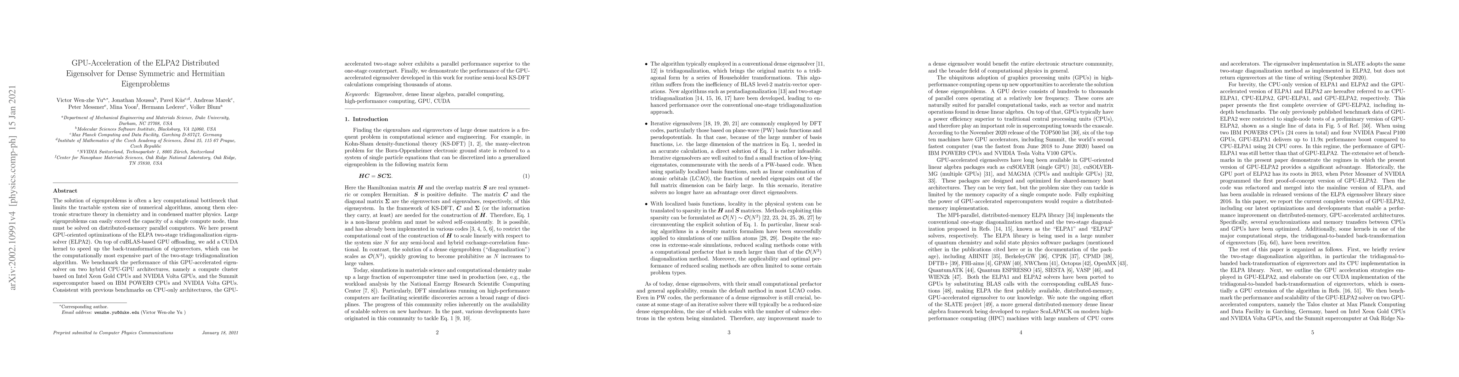 This paper presents GPU-accelerated optimizations of the ELPA2 distributed eigensolver for dense symmetric and Hermitian eigenproblems, focusing on speeding up the back-transformation of eigenvectors. Benchmarks on hybrid CPU-GPU architectures show superior parallel performance compared to CPU-only solutions.