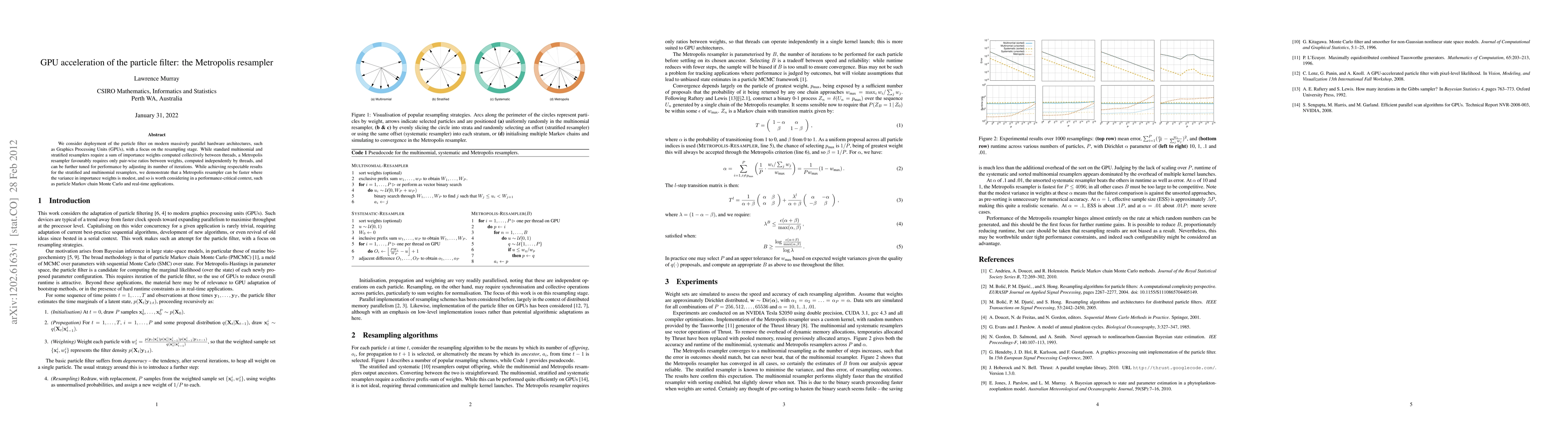 We consider deployment of the particle filter on modern massively parallel hardware architectures, such as Graphics Processing Units (GPUs), with a focus on the resampling stage. While standard multinomial and stratified resamplers require a sum of importance weights computed collectively between threads, a Metropolis resampler favourably requires only pair-wise ratios between weights, computed independently by threads, and can be further tuned for performance by adjusting its number of iterations. While achieving respectable results for the stratified and multinomial resamplers, we demonstrate that a Metropolis resampler can be faster where the variance in importance weights is modest, and so is worth considering in a performance-critical context, such as particle Markov chain Monte Carlo and real-time applications.