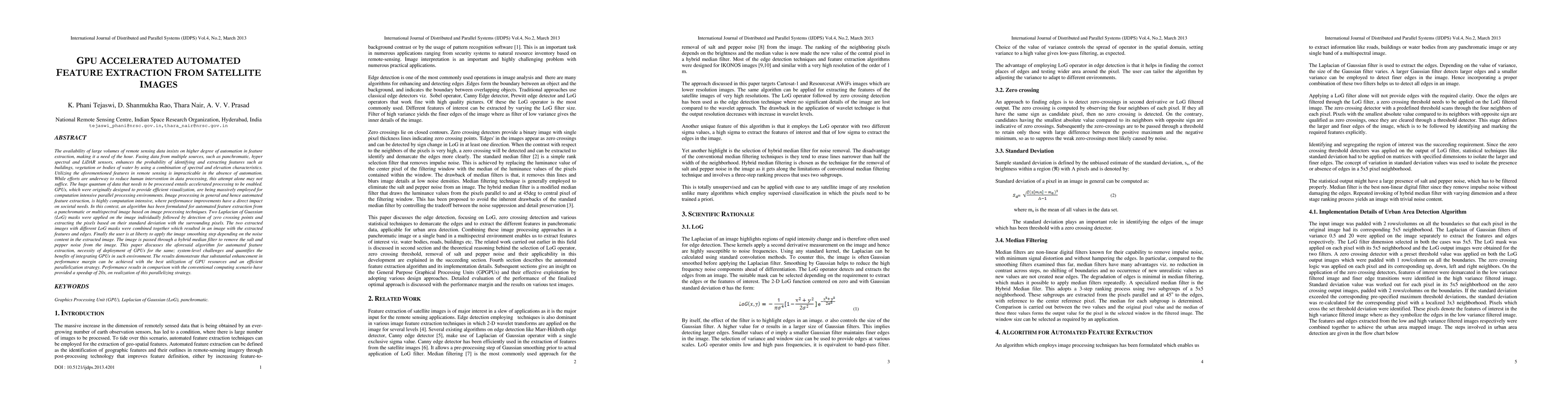 The availability of large volumes of remote sensing data insists on higher degree of automation in feature extraction, making it a need of the hour.The huge quantum of data that needs to be processed entails accelerated processing to be enabled.GPUs, which were originally designed to provide efficient visualization, are being massively employed for computation intensive parallel processing environments. Image processing in general and hence automated feature extraction, is highly computation intensive, where performance improvements have a direct impact on societal needs. In this context, an algorithm has been formulated for automated feature extraction from a panchromatic or multispectral image based on image processing techniques. Two Laplacian of Guassian (LoG) masks were applied on the image individually followed by detection of zero crossing points and extracting the pixels based on their standard deviation with the surrounding pixels. The two extracted images with different LoG masks were combined together which resulted in an image with the extracted features and edges. Finally the user is at liberty to apply the image smoothing step depending on the noise content in the extracted image. The image is passed through a hybrid median filter to remove the salt and pepper noise from the image. This paper discusses the aforesaid algorithm for automated feature extraction, necessity of deployment of GPUs for the same; system-level challenges and quantifies the benefits of integrating GPUs in such environment. The results demonstrate that substantial enhancement in performance margin can be achieved with the best utilization of GPU resources and an efficient parallelization strategy. Performance results in comparison with the conventional computing scenario have provided a speedup of 20x, on realization of this parallelizing strategy.