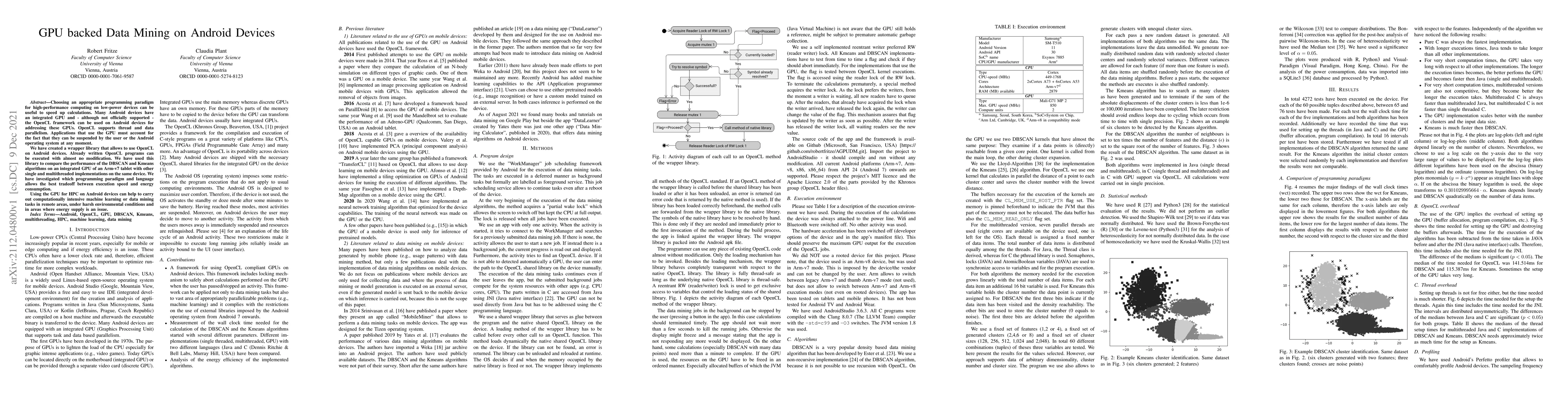 Choosing an appropriate programming paradigm for high-performance computing on low-power devices can be useful to speed up calculations. Many Android devices have an integrated GPU and - although not officially supported - the OpenCL framework can be used on Android devices for addressing these GPUs. OpenCL supports thread and data parallelism. Applications that use the GPU must account for the fact that they can be suspended by the user or the Android operating system at any moment. We have created a wrapper library that allows to use OpenCL on Android devices. Already written OpenCL programs can be executed with almost no modification. We have used this library to compare the performance of the DBSCAN and Kmeans algorithms on an integrated GPU of an Arm-v7 tablet with other single and multithreaded implementations on the same device. We have investigated which programming paradigm and language allows the best tradeoff between execution speed and energy consumption. Using the GPU for HPC on Android devices can help to carry out computationally intensive machine learning or data mining tasks in remote areas, under harsh environmental conditions and in areas where energy supply is an issue.