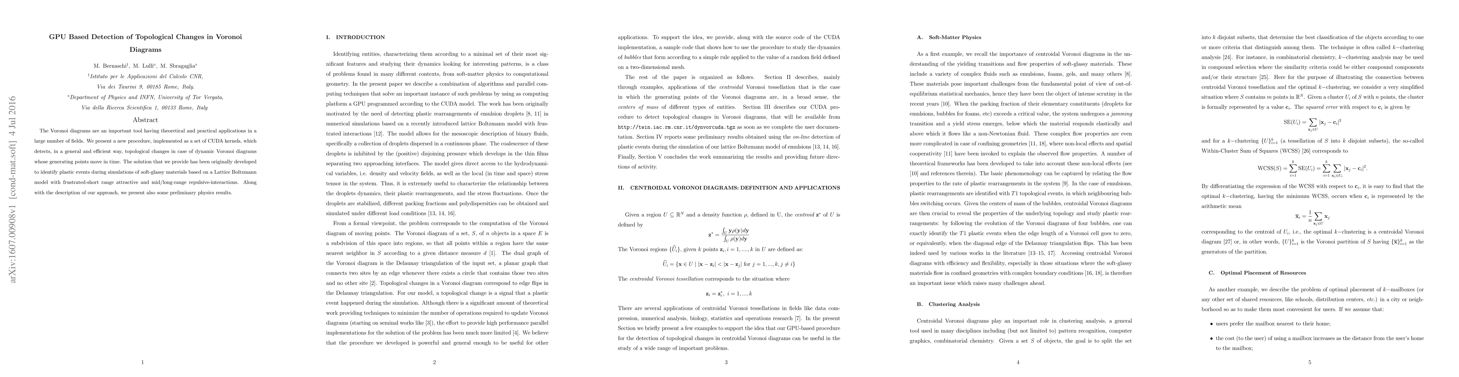 This paper introduces a GPU-based method using CUDA kernels to detect topological changes in dynamic Voronoi diagrams. The approach was initially designed for identifying plastic events in simulations of soft-glassy materials, and it also presents preliminary physics results.