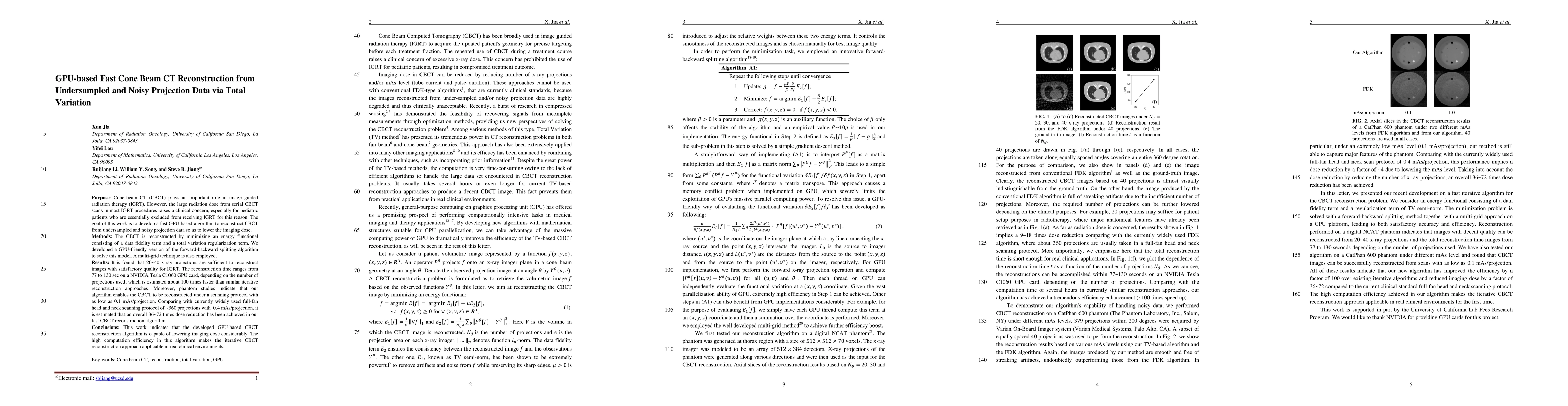 This paper presents a GPU-based algorithm for fast cone-beam CT (CBCT) reconstruction from undersampled and noisy projection data, achieving significant dose reduction. The method uses total variation regularization and a forward-backward splitting algorithm to reconstruct images from as few as 20~40 projections, offering a 100 times faster reconstruction time compared to traditional methods.