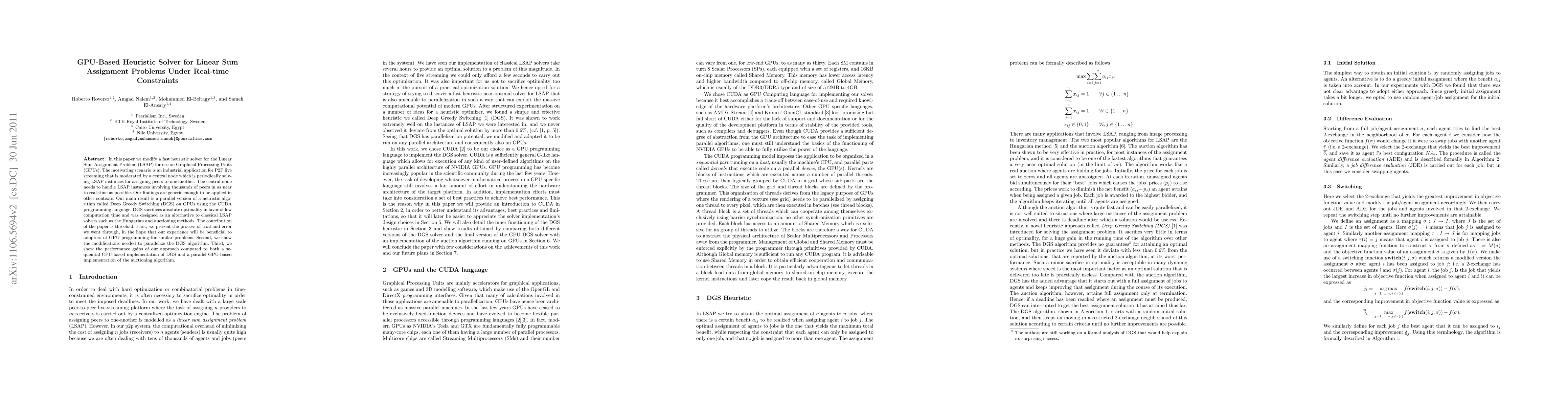 In this paper we modify a fast heuristic solver for the Linear Sum Assignment Problem (LSAP) for use on Graphical Processing Units (GPUs). The motivating scenario is an industrial application for P2P live streaming that is moderated by a central node which is periodically solving LSAP instances for assigning peers to one another. The central node needs to handle LSAP instances involving thousands of peers in as near to real-time as possible. Our findings are generic enough to be applied in other contexts. Our main result is a parallel version of a heuristic algorithm called Deep Greedy Switching (DGS) on GPUs using the CUDA programming language. DGS sacrifices absolute optimality in favor of low computation time and was designed as an alternative to classical LSAP solvers such as the Hungarian and auctioning methods. The contribution of the paper is threefold: First, we present the process of trial and error we went through, in the hope that our experience will be beneficial to adopters of GPU programming for similar problems. Second, we show the modifications needed to parallelize the DGS algorithm. Third, we show the performance gains of our approach compared to both a sequential CPU-based implementation of DGS and a parallel GPU-based implementation of the auctioning algorithm.