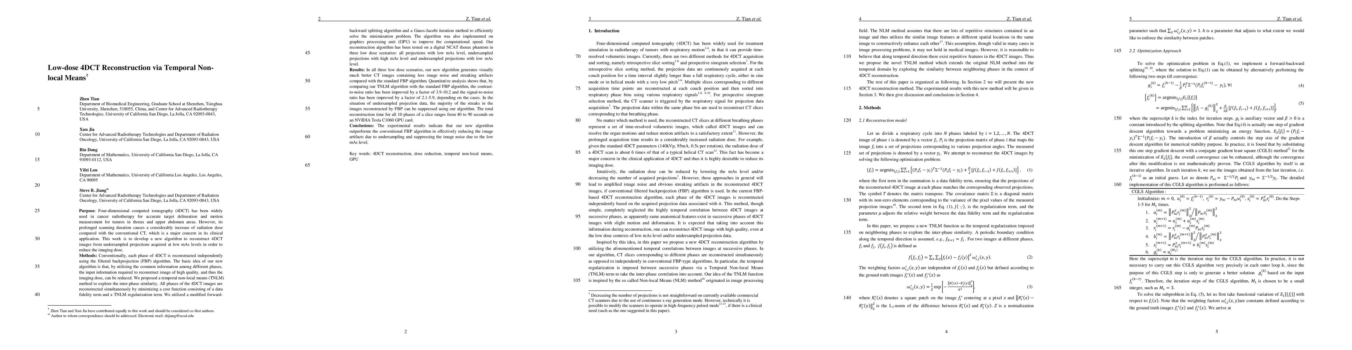 Four-dimensional computed tomography (4DCT) has been widely used in cancer radiotherapy for accurate target delineation and motion measurement for tumors in thorax and upper abdomen areas. However, 4DCT simulation is associated with much higher imaging dose than conventional CT simulation, which is a major concern in its clinical application. Conventionally, each phase of 4DCT is reconstructed independently using the filtered backprojection (FBP) algorithm. The basic idea of our new algorithm is that, by utilizing the common information among different phases, the input information required to reconstruct image of high quality, and thus the imaging dose, can be reduced. We proposed a temporal non-local means (TNLM) method to explore the inter-phase similarity. All phases of the 4DCT images are reconstructed simultaneously by minimizing a cost function consisting of a data fidelity term and a TNLM regularization term. We utilized a forward-backward splitting algorithm and a Gauss-Jacobi iteration method to efficiently solve the minimization problem. The algorithm was also implemented on graphics processing unit (GPU) to achieve a high computational speed. Our reconstruction algorithm has been tested on a digital NCAT thorax phantom in three low dose scenarios. Our new algorithm generates visually much better CT images containing less image noise and streaking artifacts compared with the standard FBP algorithm. Quantitative analysis shows that much higher contrast-to-noise ratio and signal-to-noise ratio can be obtained using our algorithm. The total reconstruction time for all 10 phases of a slice ranges from 90 to 140 seconds on an NVIDIA Tesla C1060 GPU card.