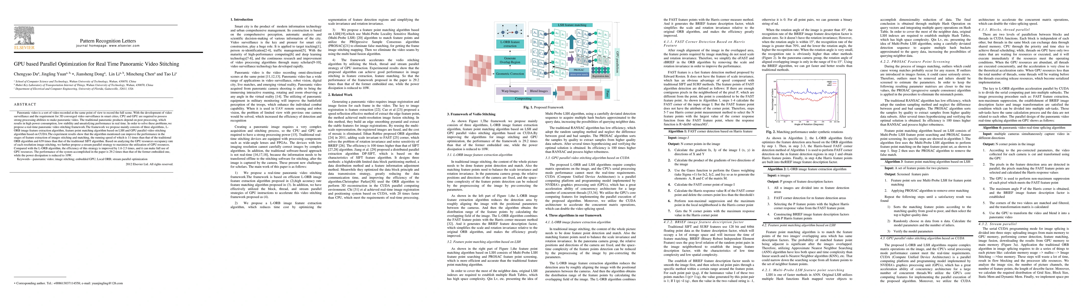This paper proposes a GPU-based parallel optimization framework for real-time panoramic video stitching, utilizing LORB, LSH, and CUDA algorithms to significantly enhance performance and efficiency. The proposed method achieves 11x and 639x speedups over traditional ORB and SIFT algorithms, respectively, and reduces power dissipation to 10W.