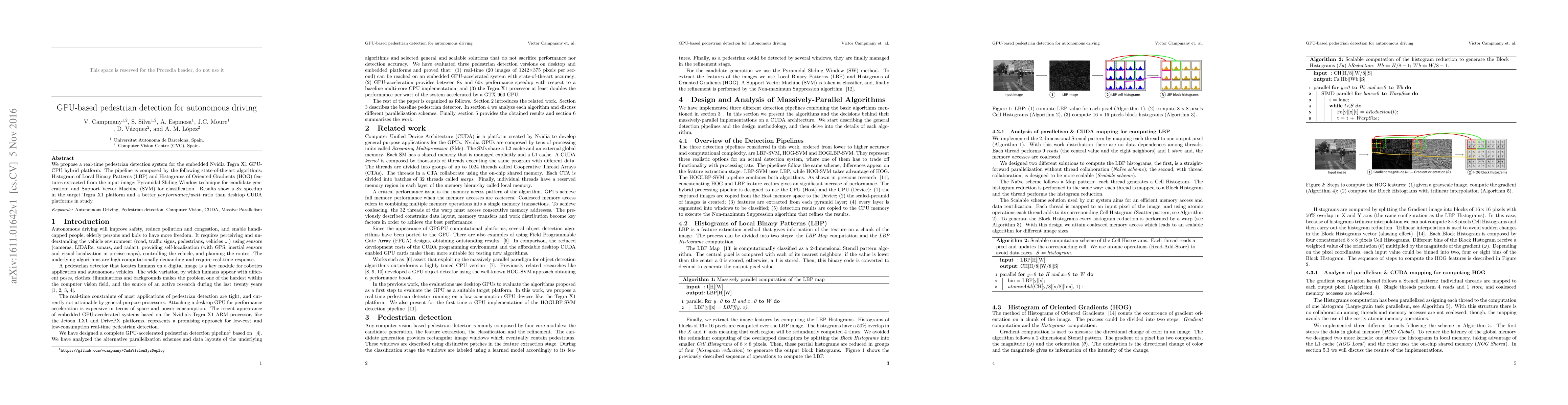 We propose a real-time pedestrian detection system for the embedded Nvidia Tegra X1 GPU-CPU hybrid platform. The pipeline is composed by the following state-of-the-art algorithms: Histogram of Local Binary Patterns (LBP) and Histograms of Oriented Gradients (HOG) features extracted from the input image; Pyramidal Sliding Window technique for candidate generation; and Support Vector Machine (SVM) for classification. Results show a 8x speedup in the target Tegra X1 platform and a better performance/watt ratio than desktop CUDA platforms in study.